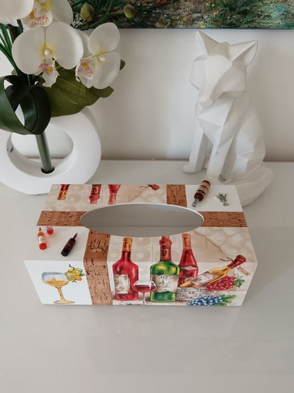 Chaque pièce est unique et artisanale, réalisée avec soin pour combiner utilité et décoration. Cette boîte cache élégamment vos mouchoirs tout en devenant un véritable objet de charme, idéal pour la cuisine, la salle à manger ou comme cadeau pour les amateurs de vin.