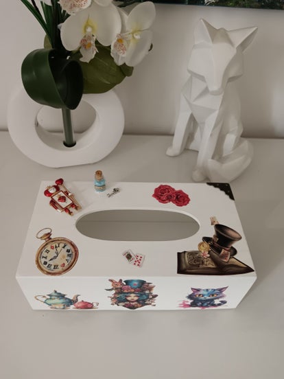 Boîte à mouchoirs en bois inspirée d'Alice aux pays des merveilles, parfaite comme décoration dans une chambre, un salon, une bibliothèque.... Décoration d'intérieure originale et artisanale.