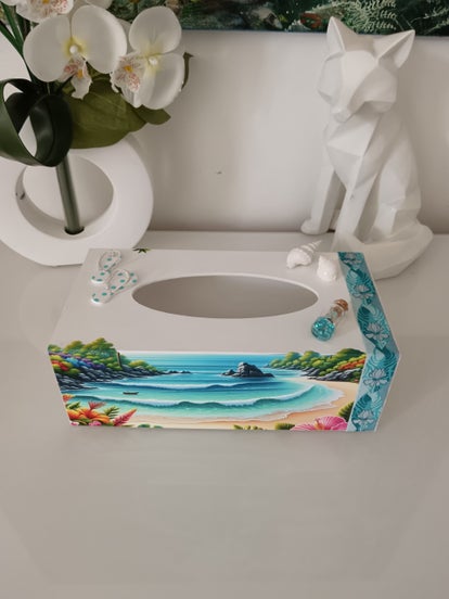 Craquez pour cette boîte à mouchoirs aux airs de vacances. Son décor tropical aux couleurs douces est rehaussé par de délicats éléments en relief : coquillages, tongs et petit flacon en verre.