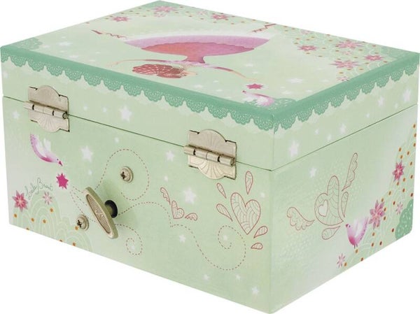 Lors de l’ouverture du coffret à bijoux, une petite danseuse se met à tourner au son d’une délicate petite musique. La clé du mécanisme de la boite à musique se trouve au dos du coffre. En carton épais et intérieur enn velour.
