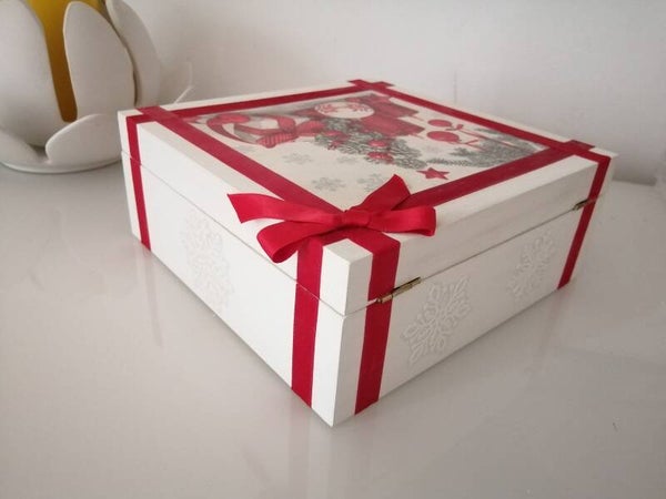 Décorée à la main grâce à la technique du serviettage. Peinture acrylique blanche, ruban rouge et deux couches de vernis pour la protéger. Création artisanale.