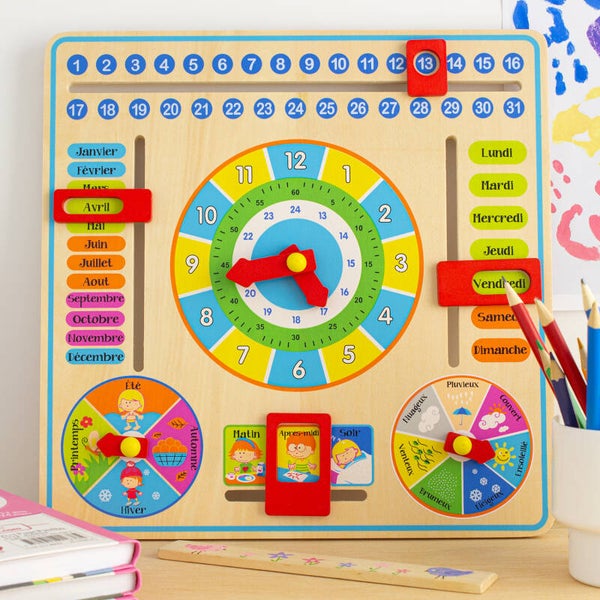 L'éphéméride en bois est indispensable dans la chambre d'un enfant. Tout les jours l'enfant prend l'habitude de déplacer les éléments pour correspondre à la nouvelle journée. Parfait pour s'orienter dans le temps et apprendre l'heure, le jour, le mois, les saisons. Observer la météo, mettre la date...