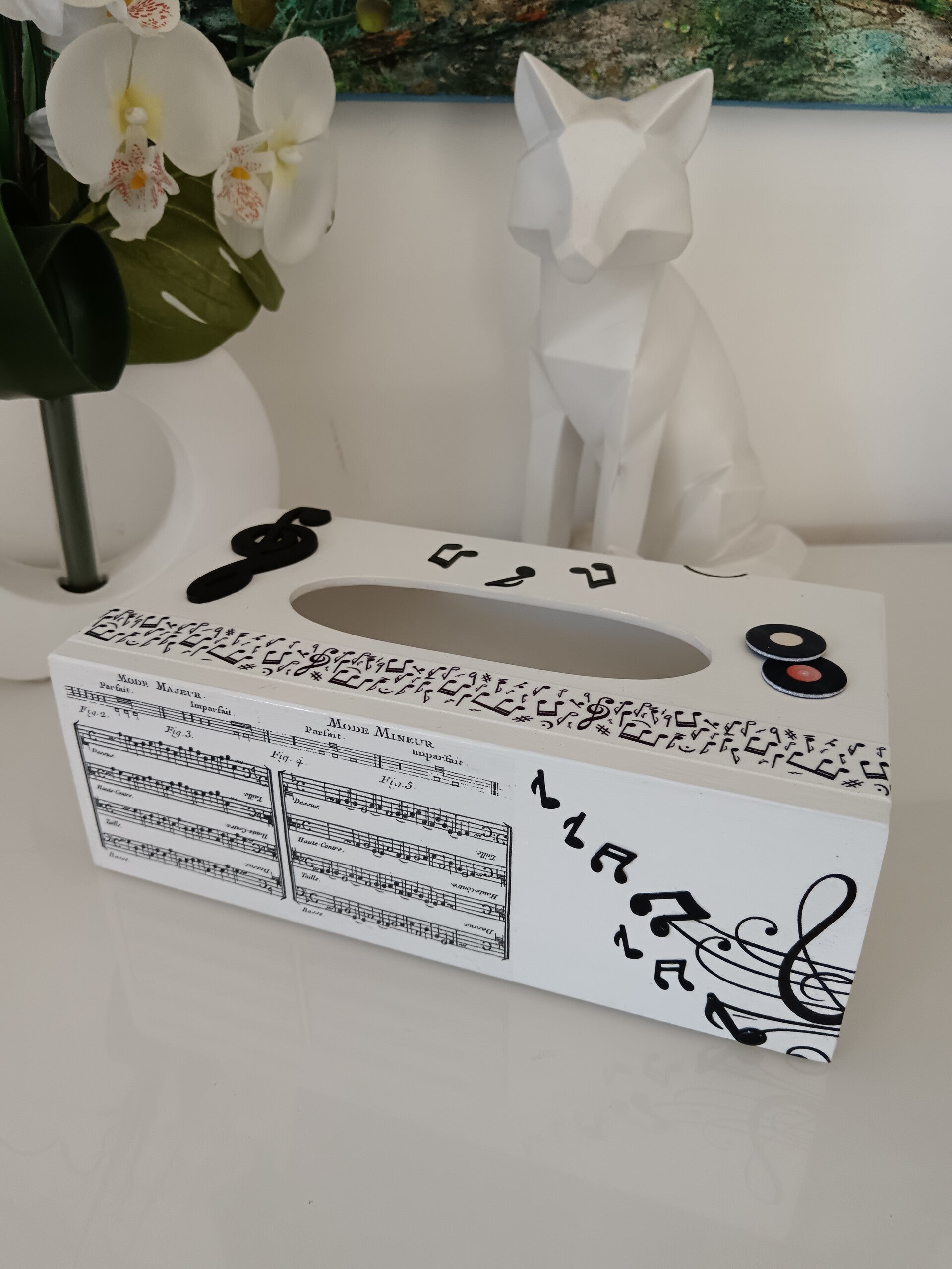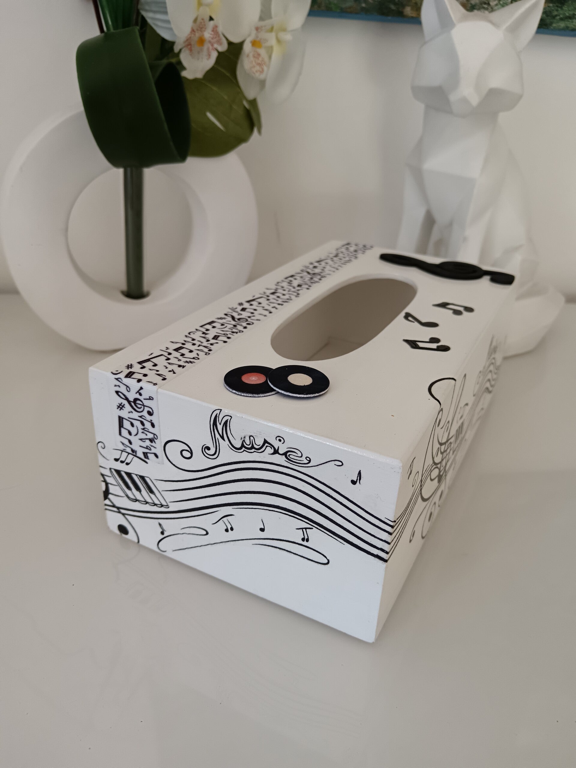 Boîte à mouchoirs en bois peinte en blanc et décorée à la main avec la technique du serviettage. Son design noir et blanc met à l’honneur notes de musique, portée musicale et clés pour une ambiance élégante et harmonieuse. Détails en relief pour une finition originale et moderne. Pratique et décorative, elle habille parfaitement une boîte de mouchoirs standard et s’intègre idéalement dans un salon, un studio ou une chambre d’amateur de musique. Une création artisanale unique, idéale pour les passionnés de musique. Protégée par plusieurs couches de vernis.