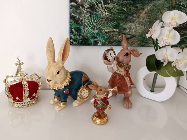 Très beau lapin avec montre à gousset. Parfait pour Pâques, pour les fans de lapins, pour les amoureux d'Alice au pays des merveilles. Sa jolie collerette et les détails effet feuille d'or en font aussi une décoration vintage. En polyrésine.