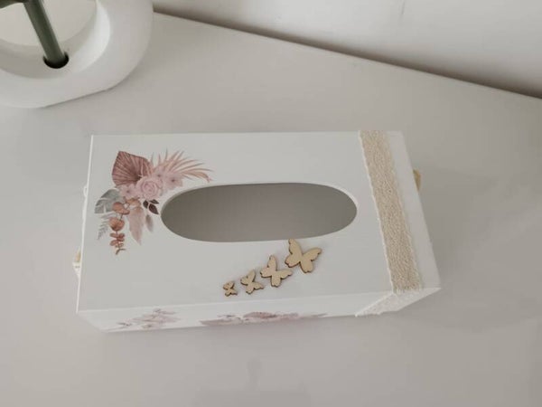 Boîte à mouchoirs en bois décorée à la main. Le style bohème chic ira parfaitement dans votre décoration intérieure. Raffinée et élégante, elle est décorée d'un ruban et de noeuds en coton. Parfaite pour offir à un anniversaire, la fête des mères, noël... Protégée par deux couches de vernis. Création artisanale.