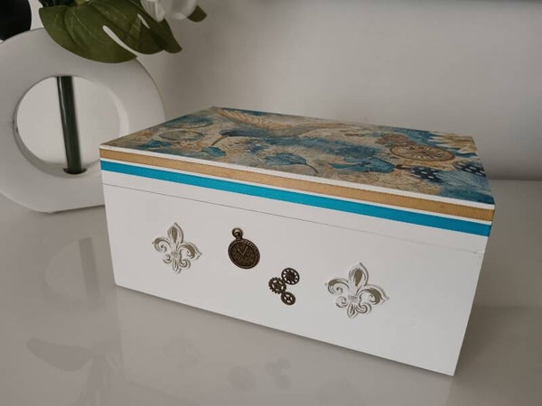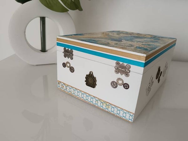 Une jolie boîte en bois à 4 compartiments parfaite pour y ranger des photos, des cartes postales, des fiches de cuisine mais aussi des vernis à ongles, des fioles d'huiles essentielles.... Décorée d'une feuille de papier de riz, de rubans, d'engrenages en métal et de fleurs de lys en bois. Chic et vintage à la fois, une idée originale pour la fête des mères, un anniversaire, Noël... Elle est protégée par deux couches de vernis. Création artisanale.