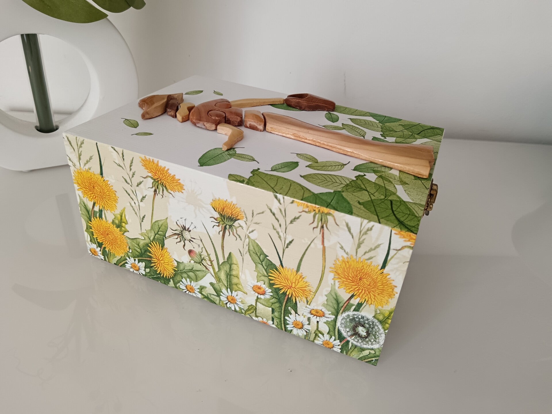 Une jolie boîte en bois à 4 compartiments parfaite pour y ranger des photos, des cartes postales, des fiches de cuisine mais aussi des vernis à ongles, des fioles d'huiles essentielles... Décorée à la main grâce à la technique du serviettage, elle est ornée d'une silhouette de femme en bois. Une idée originale pour la fête des mères, un anniversaire, Noël... Création artisanale, elle est protégée par deux couches de vernis.