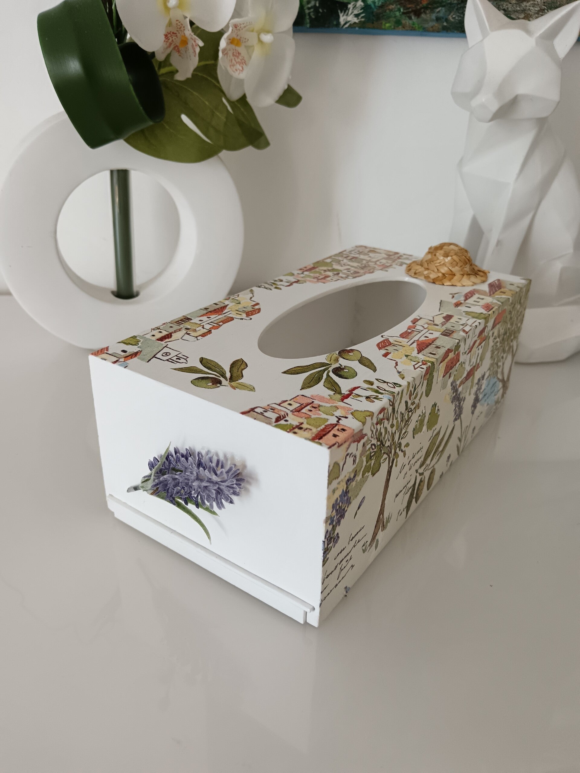 Les oliviers, la lavande, le chapeau de paille pour se protéger du soleil, ça sent bon le Sud ! Boîte à mouchoirs en bois décorée à la main. Parfaite pour offir à un anniversaire, la fête des mères, noël... Protégée par deux couches de vernis. Création artisanale.