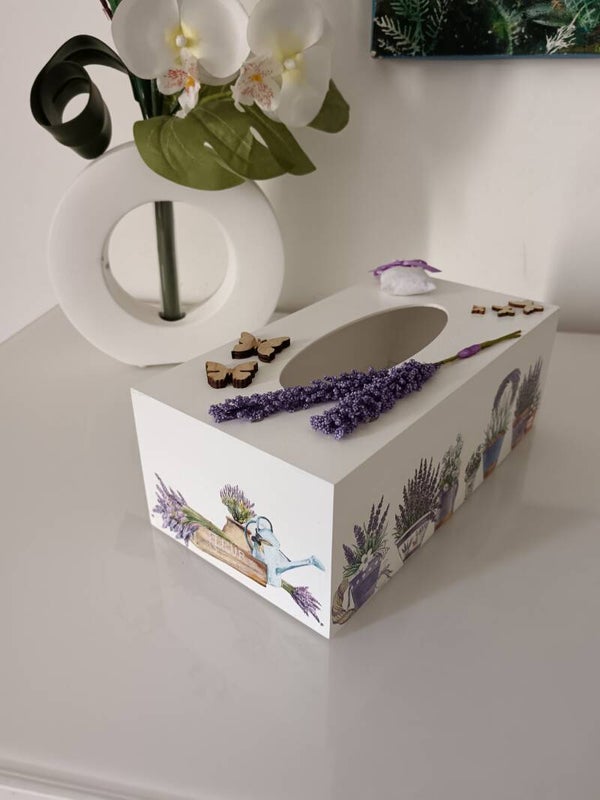 Boîte à mouchoirs en bois décorée à la main. La décoration thème lavande va faire rentrer le Sud dans votre maison. Ornée de brins de lavande artificiels, d'un petit sac en tissu et de papillons en bois. Parfaite pour offir à un anniversaire, la fête des mères, noël... Protégée par deux couches de vernis. Création artisanale.