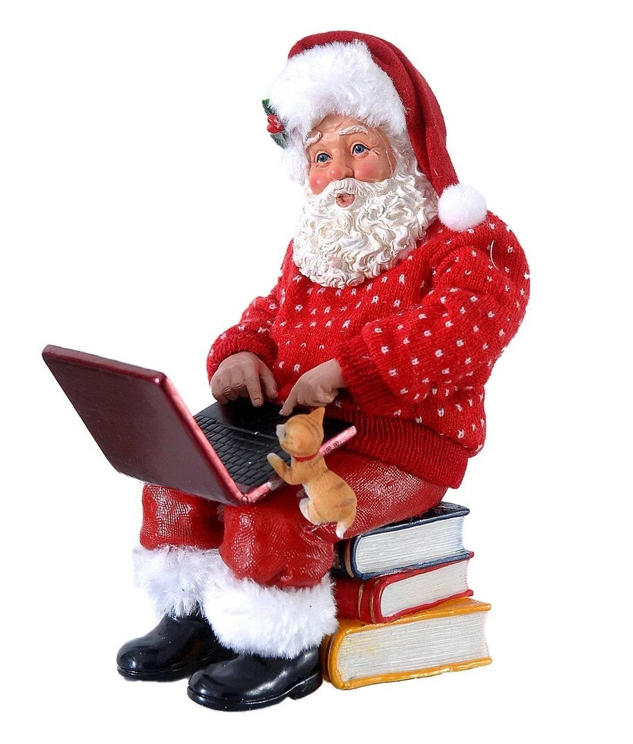 Voila que le Père-Noël délaisse les livres en faveur d'un ordinateur! Et son chaton semble bien curieux! Une figurine originale pour votre décoration de noël. En tissu et polyuréthane.