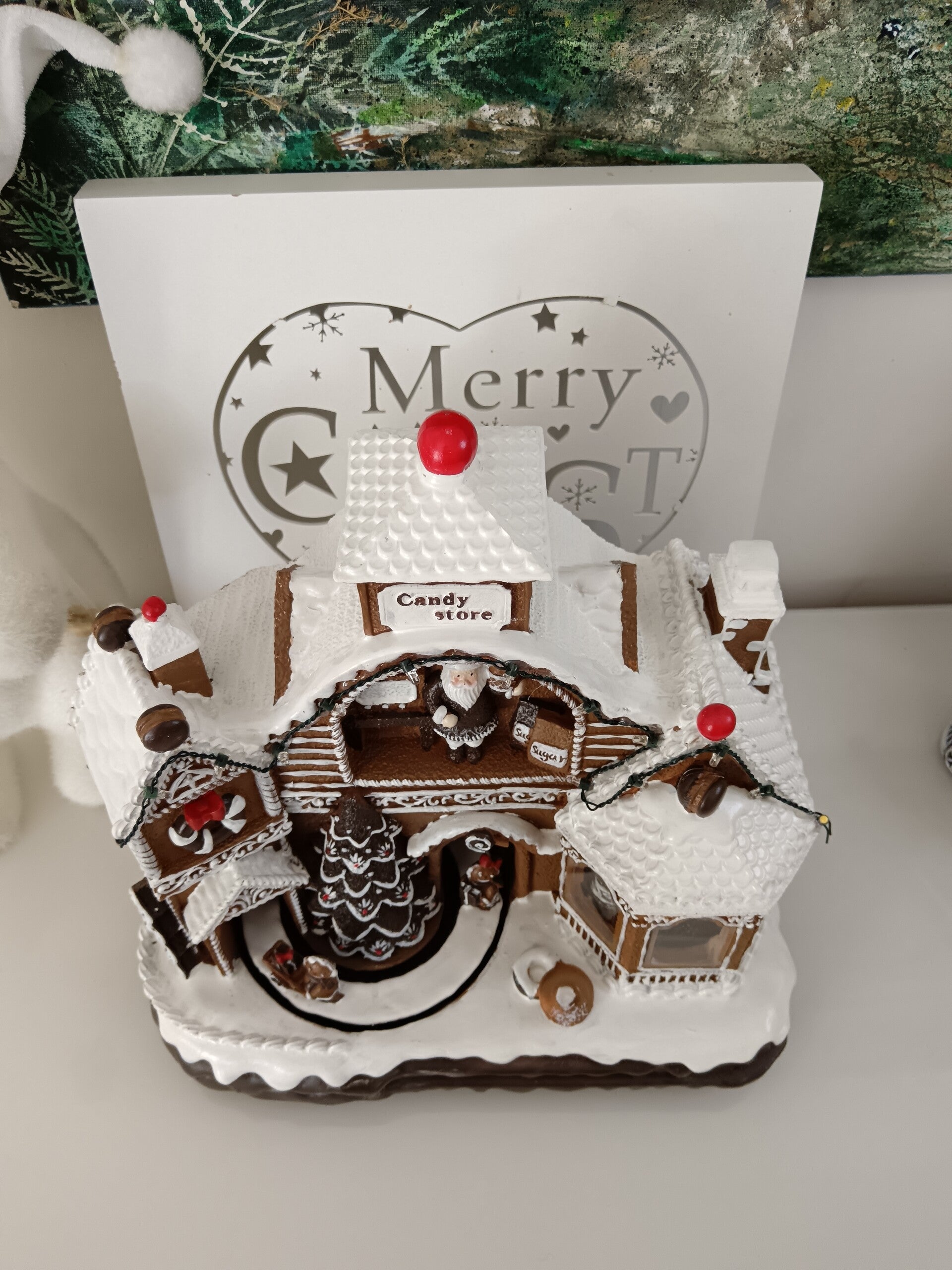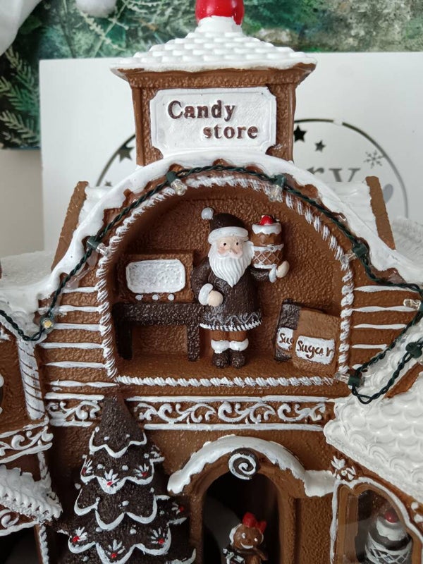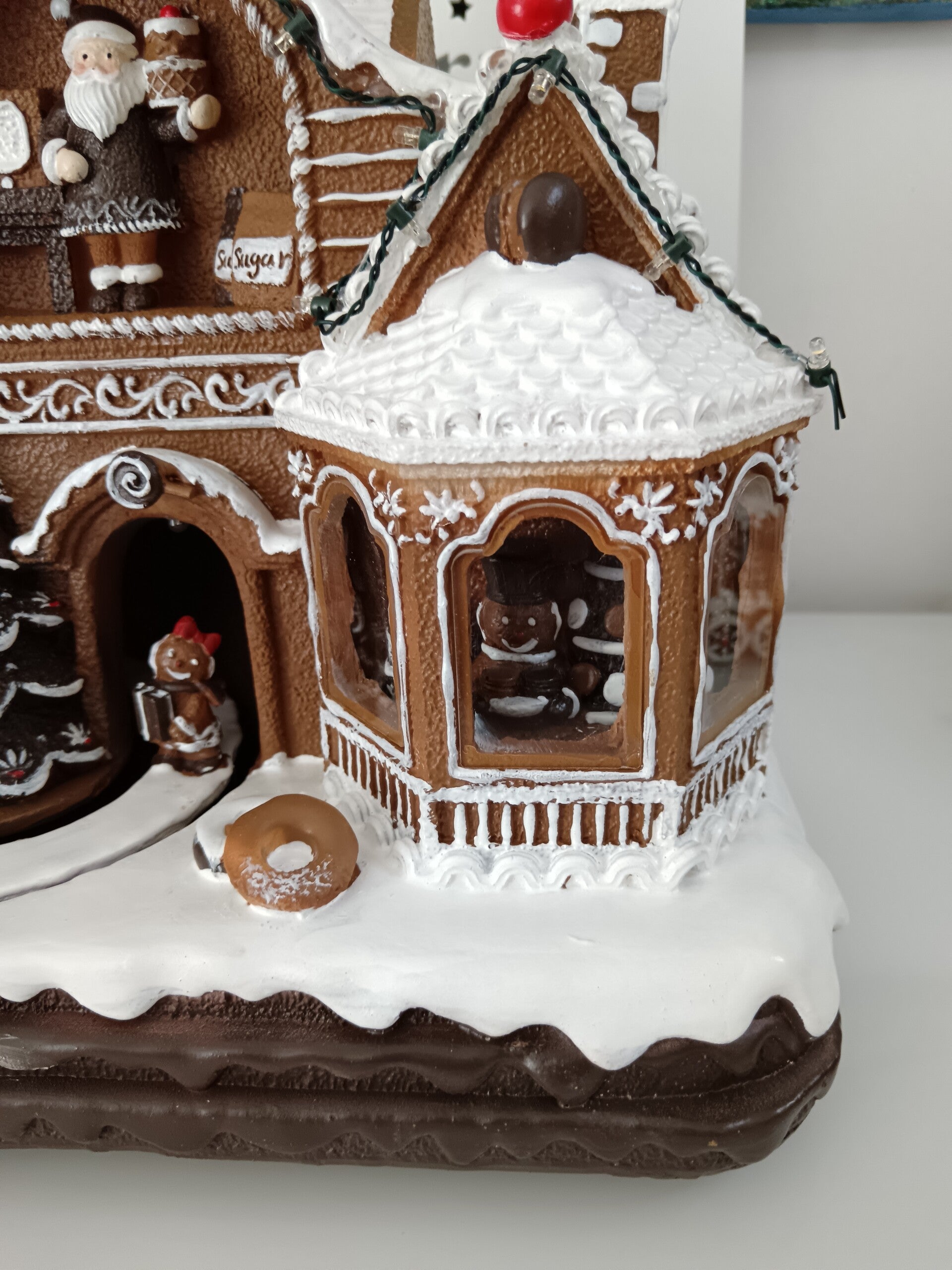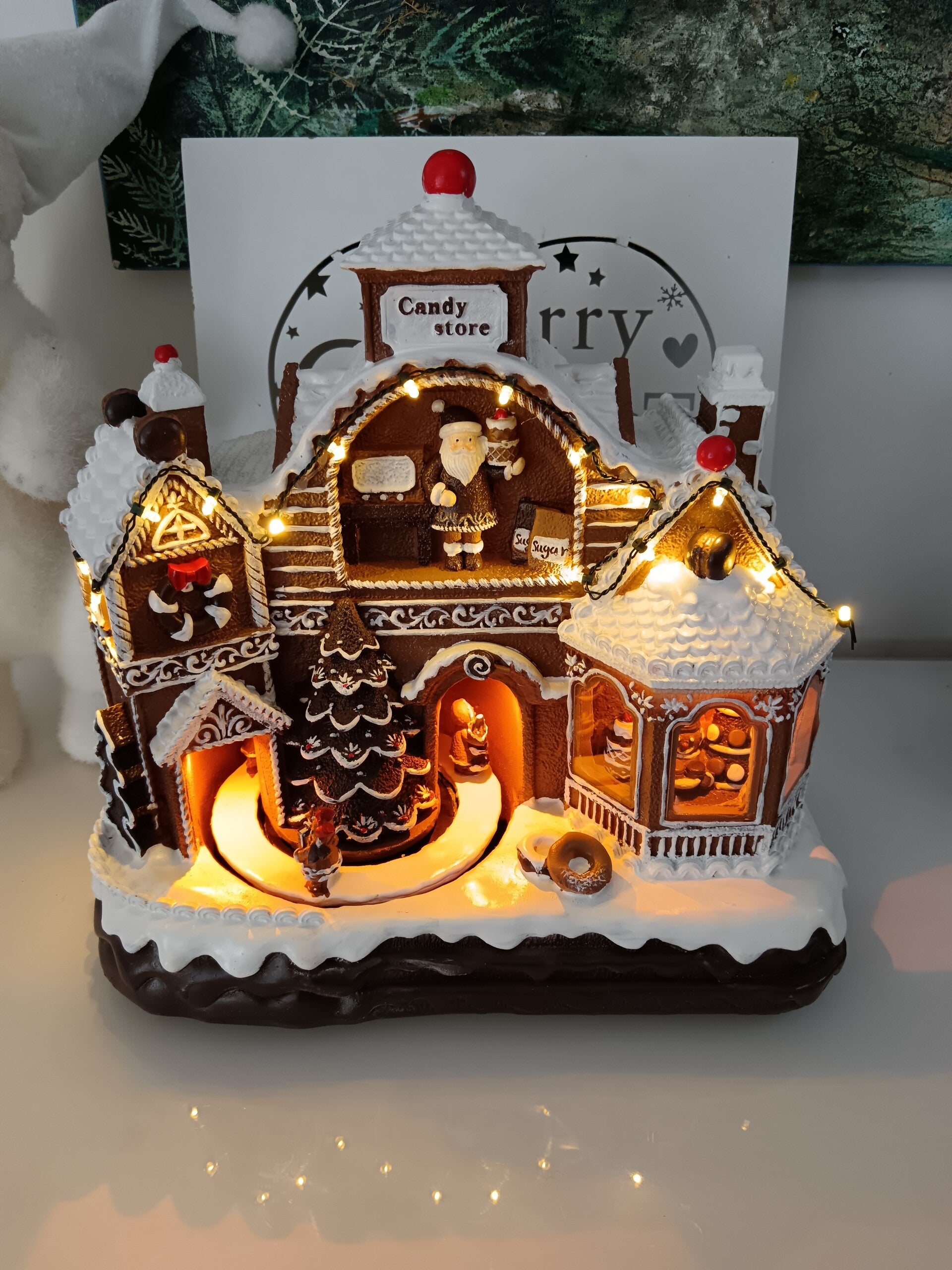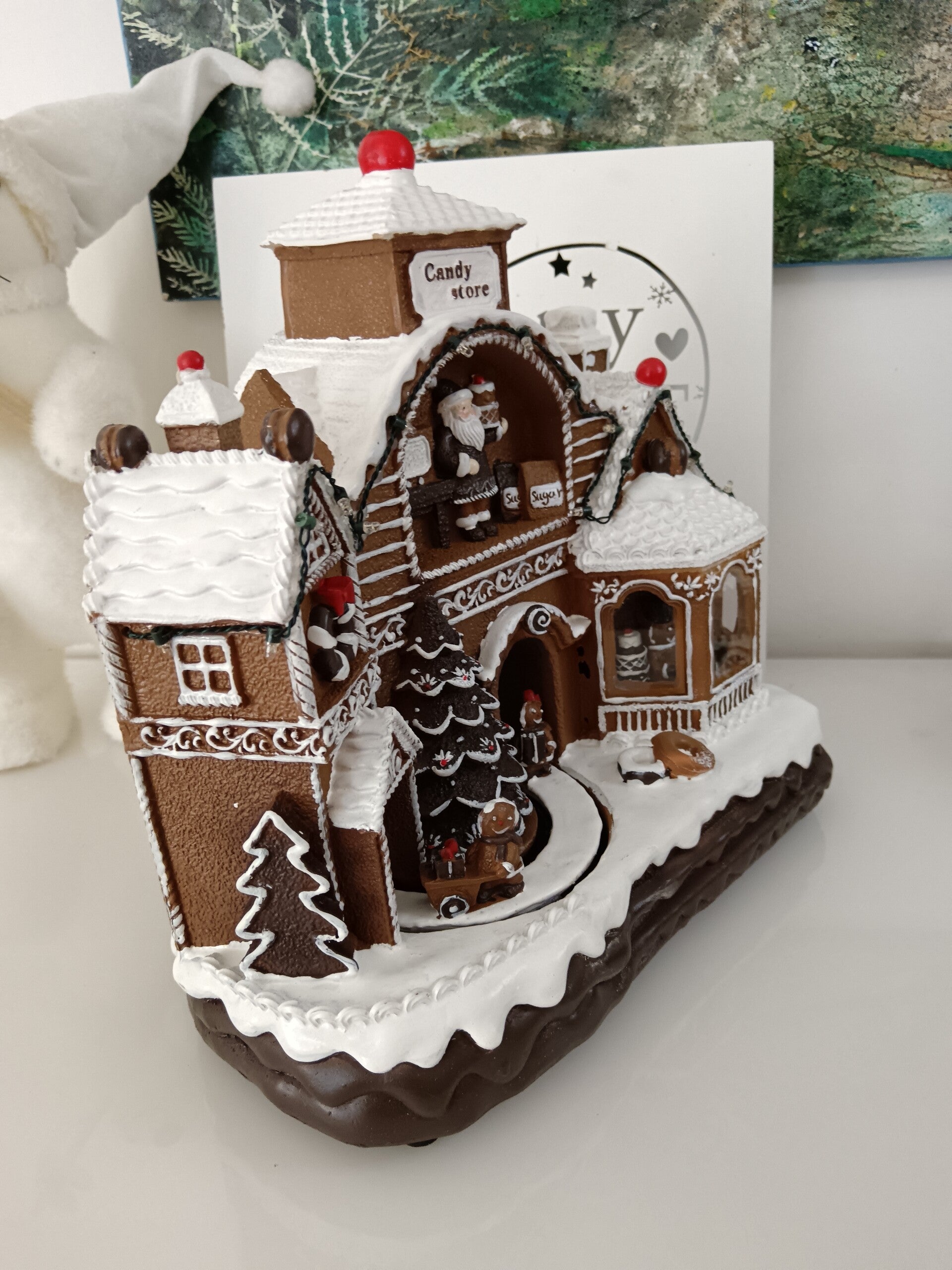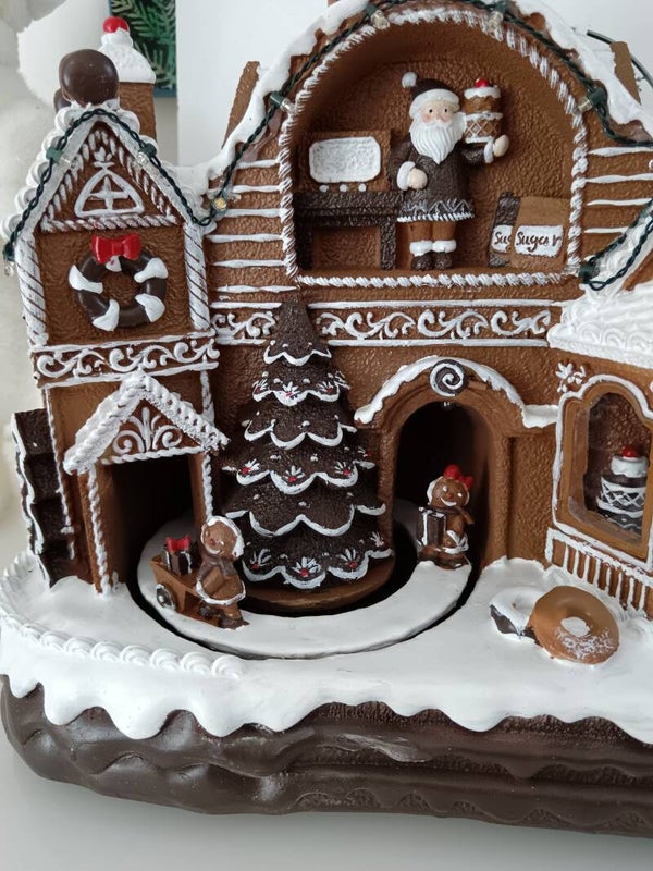 Une pièce d'exception pour votre décoration de Noël. Lumineuse et musicale, cette décoration représentant une boutique de gourmandise est décorée de nombreux détails avec une jolie vitrine et des sujets qui tournent au son de la musique. Grâce l'interrupteur vous pouvez choisir lumière avec musique ou seulement la lumière. En polyrésine.