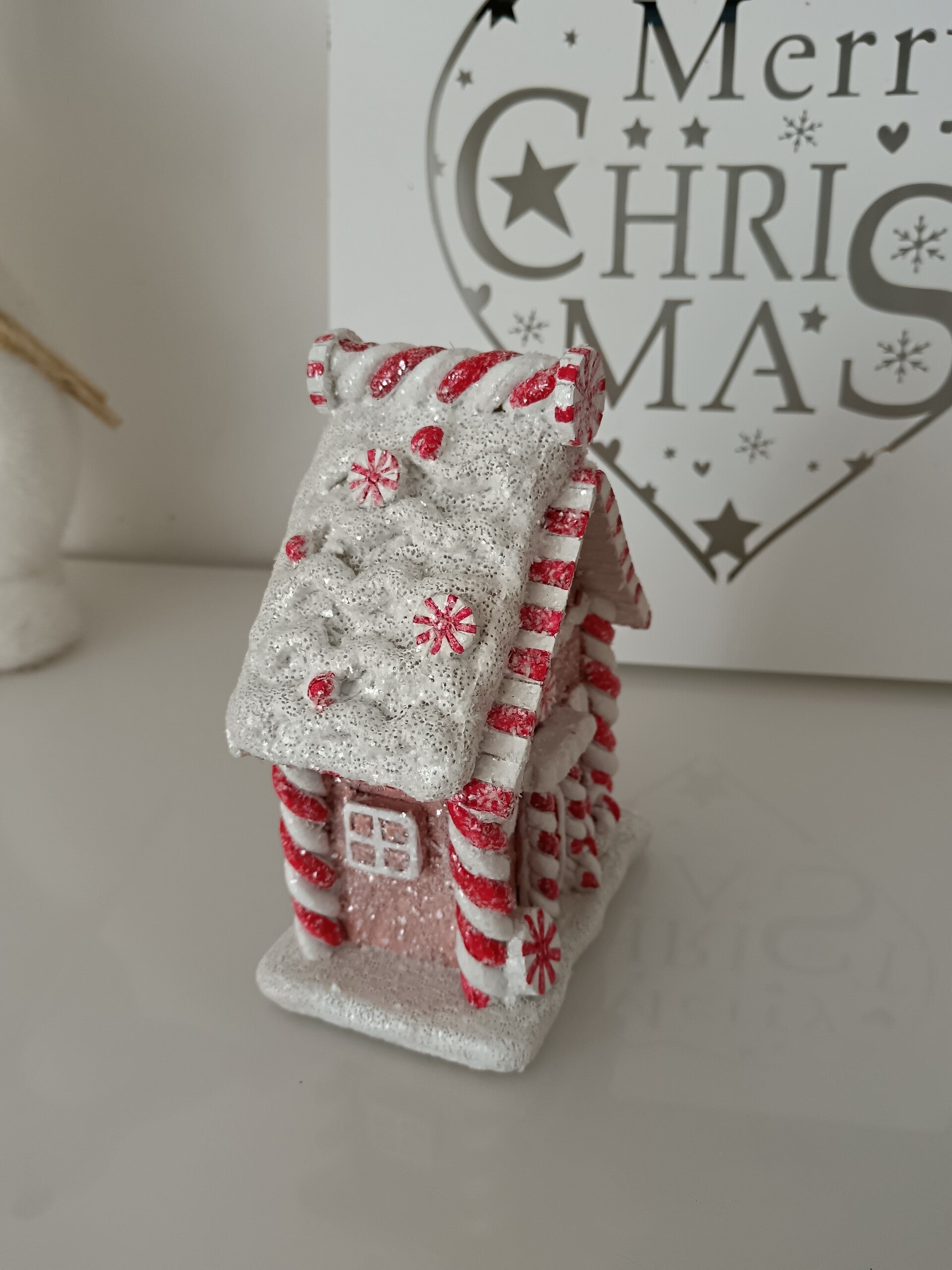 Petite maison en polyrésine parfaite pour un Noël tout en gourmandise. Les couleurs traditionnelles se marieront parfaitement à votre décoration de Noël. Elle est recouverte de paillettes.
