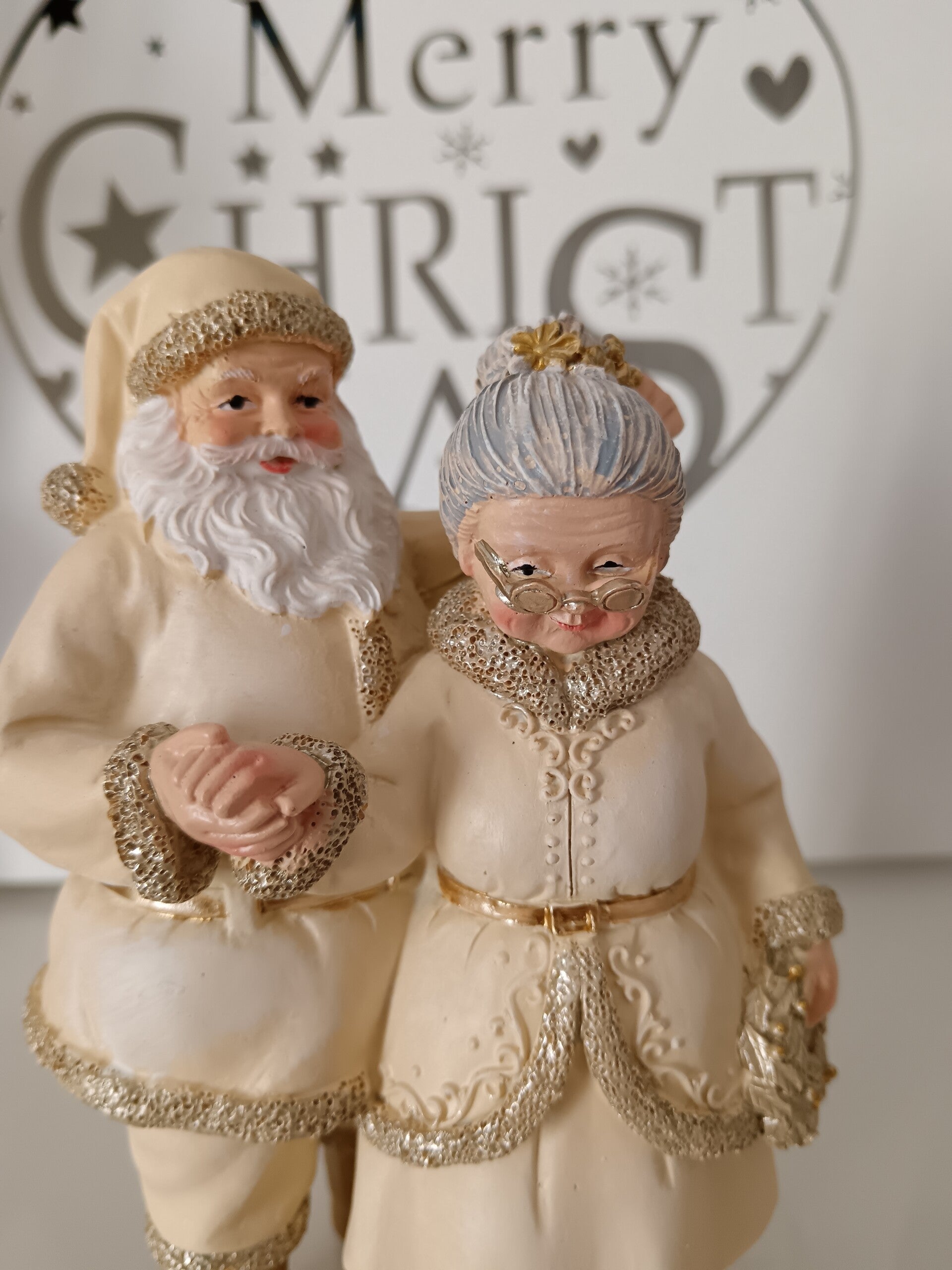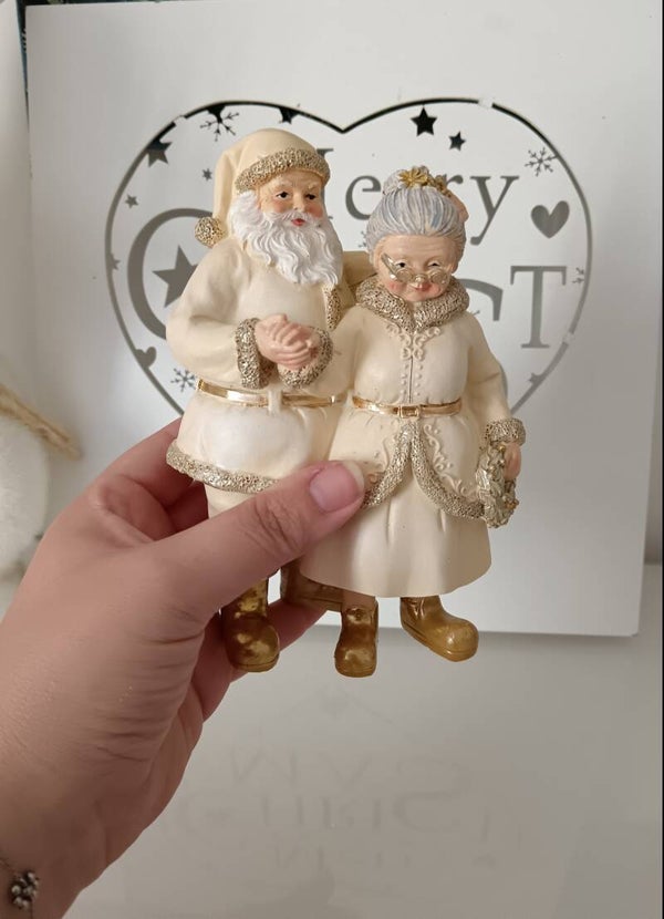 Couple Santa aux couleurs dorées et champagne. Parfait pour votre décoration de Noël chic et raffinée. En polyrésine.
