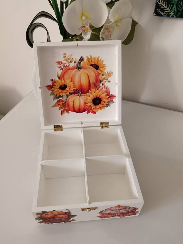 Envie d'un petit thé ? Cette boîte en bois sera parfaite pour y stocker vos sachets. Décorée aux couleurs de l'automne elle sera aussi un bel élément de décoration. Deux couches de vernis la protègent et en facilitent l'entretien. Création artisanale.
