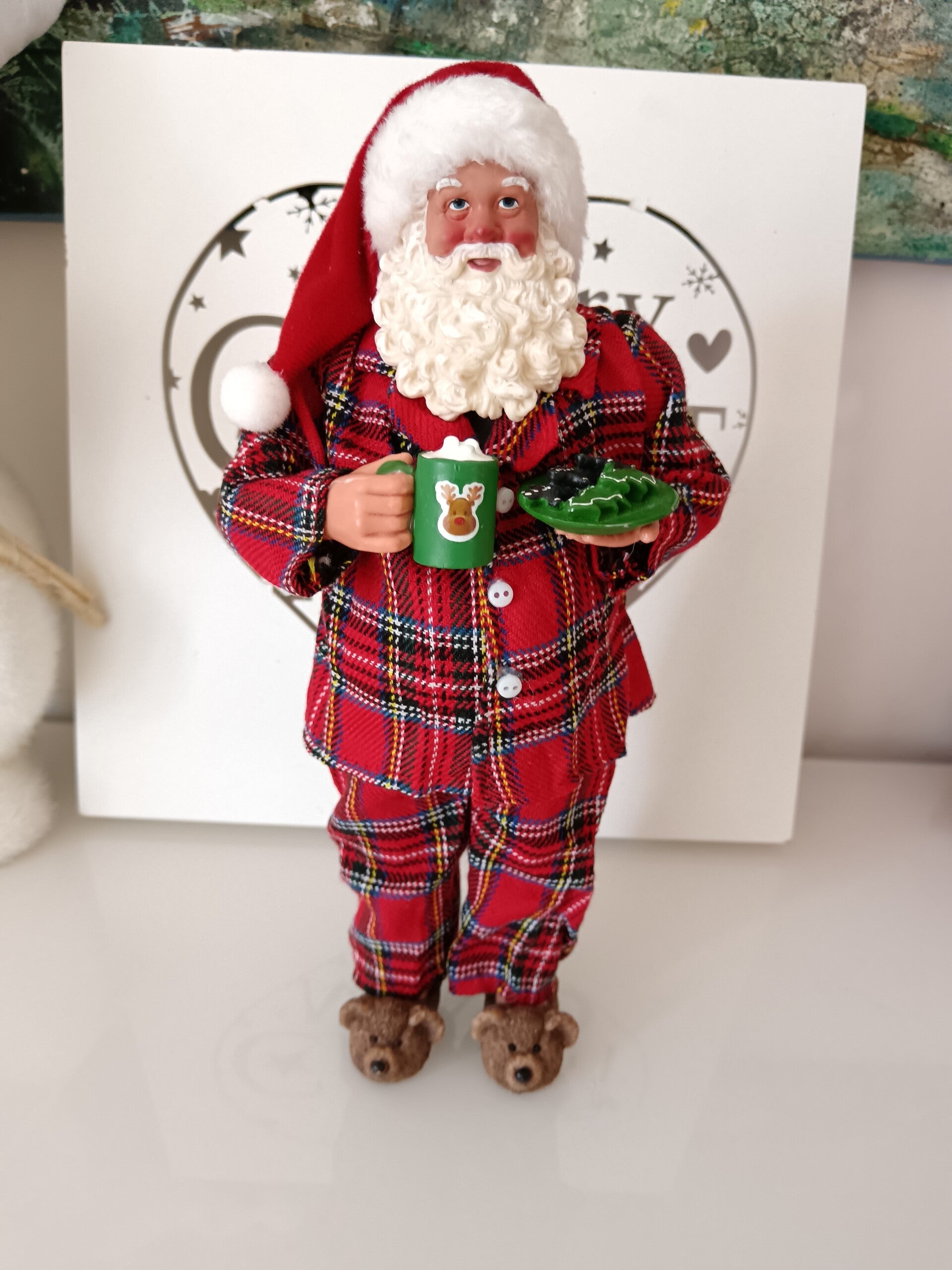 Pour une ambiance cosy, ce Père-Noël sera parfait. Pyjama, pantoufles, biscuits et chocolat chaud, tout y est pour passer une soirée détente. Une décoration de Noël qui se mariera parfaitement à votre décoration intérieure. En tissu et polyuréthane.