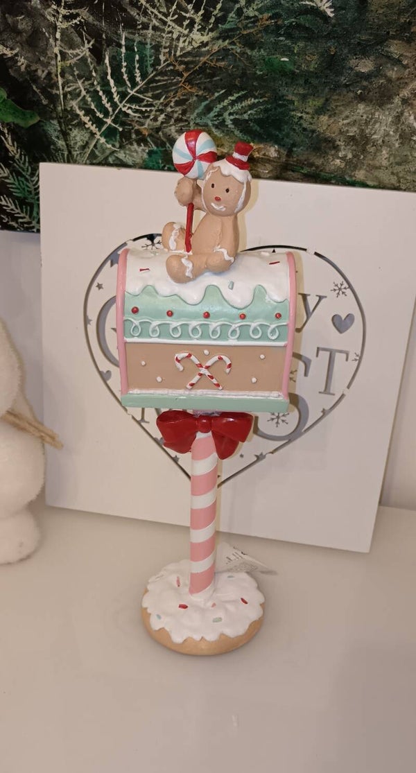 Pas de Noël sans boîte aux lettres! Et celle-ci à un style gourmand et original avec son bonhomme en pain d'épices assis tout en haut. En polyrésine.