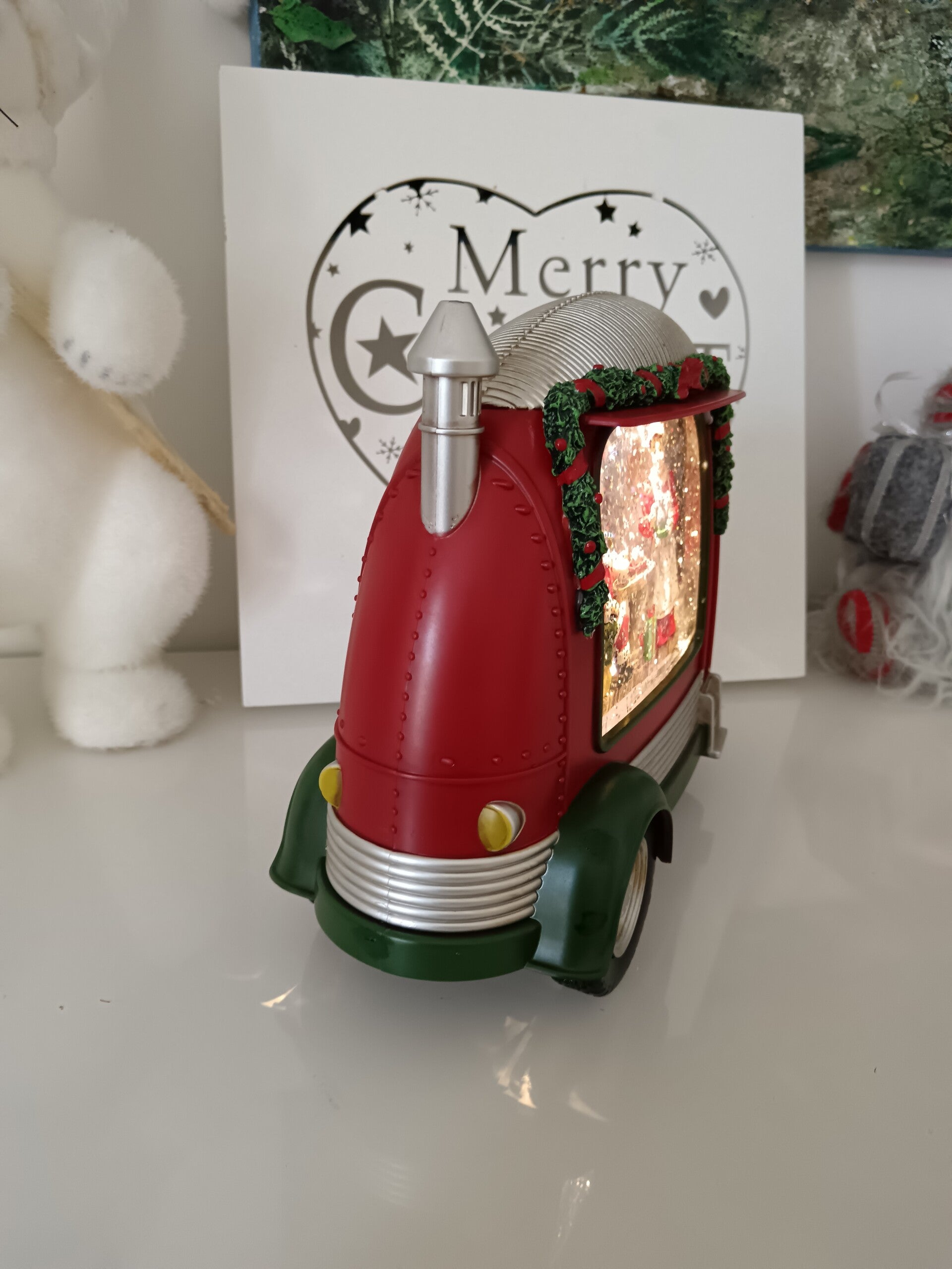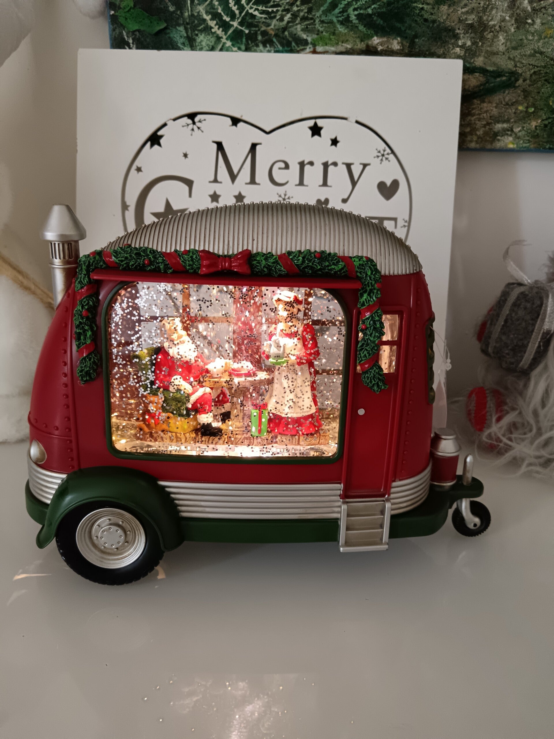 Magnifique boîte à musique en forme de caravane. Le Père Noël est assis dans son fauteuil à une table joliment dressée et Mme Santa lui apporte du cacao. Si vous appuyez sur l'interrupteur, la scène s'illumine, les paillettes s'agitent et 8 mélodies électroniques de Noël différentes se font entendre. Possibilité de couper la musique.