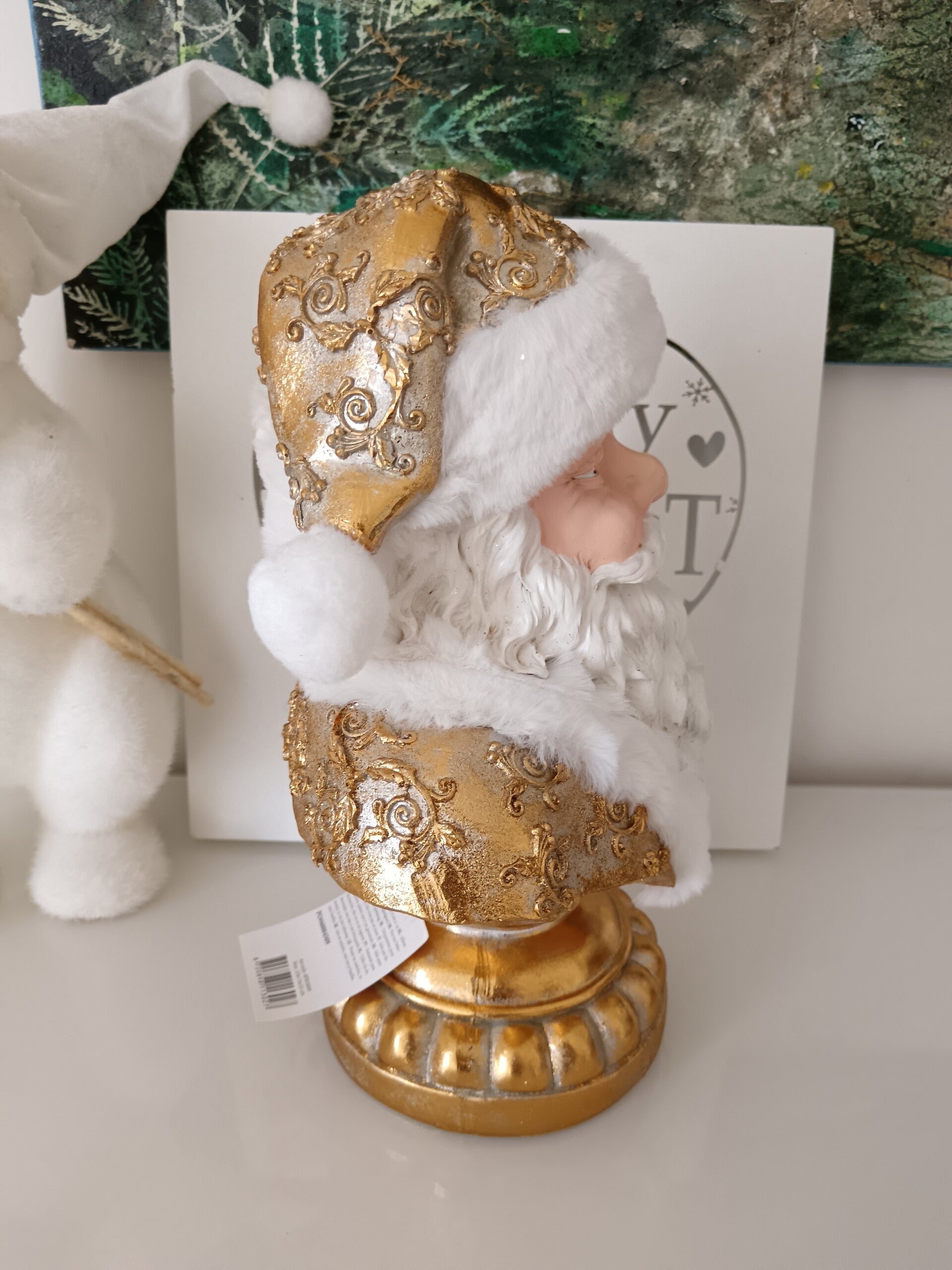 Sublimez votre décoration de Noël avec ce buste raffiné du Père Noël, orné de dorures luxueuses et d'une douce fausse fourrure. Un accent chic et majestueux qui attirera tous les regards ! En polyrésine.