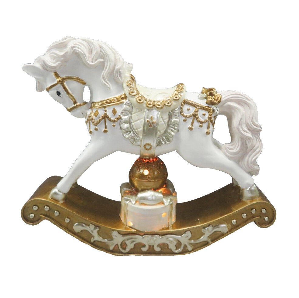 Incontournable décoration de Noël, le cheval à bascule se décline ici en blanc et or. Elégant et raffiné, il sera une pièce maîtresse de votre décoration. En polyrésine avec LED.