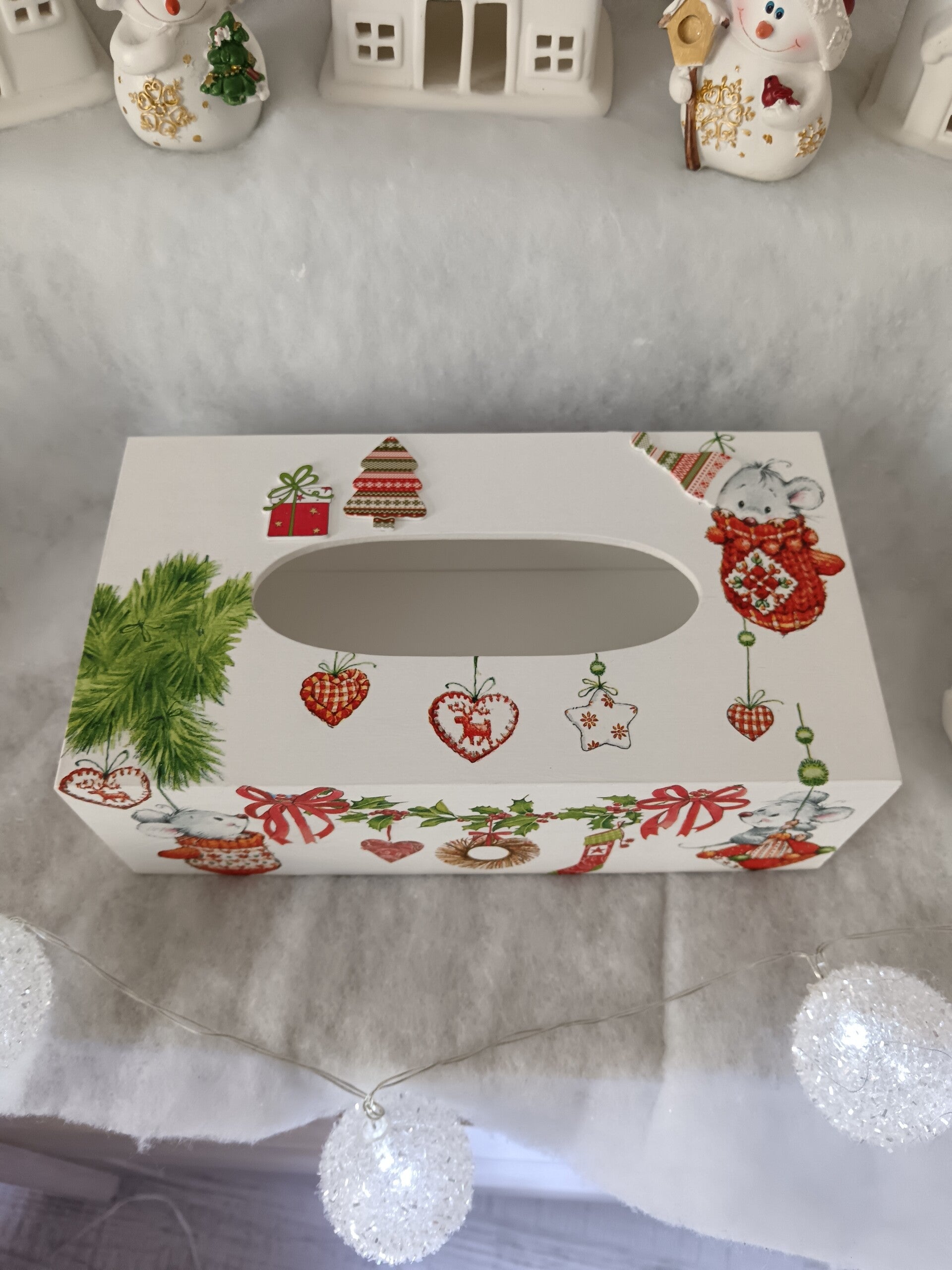 Parfaite pour les fêtes de Noël, cette boîte à mouchoirs en bois est à elle toute seule une décoration de Noël! Décorée à la main grâce à la technique du serviettage. eux couches de vernis la protègent pour un entretien facile. Création artisanale.