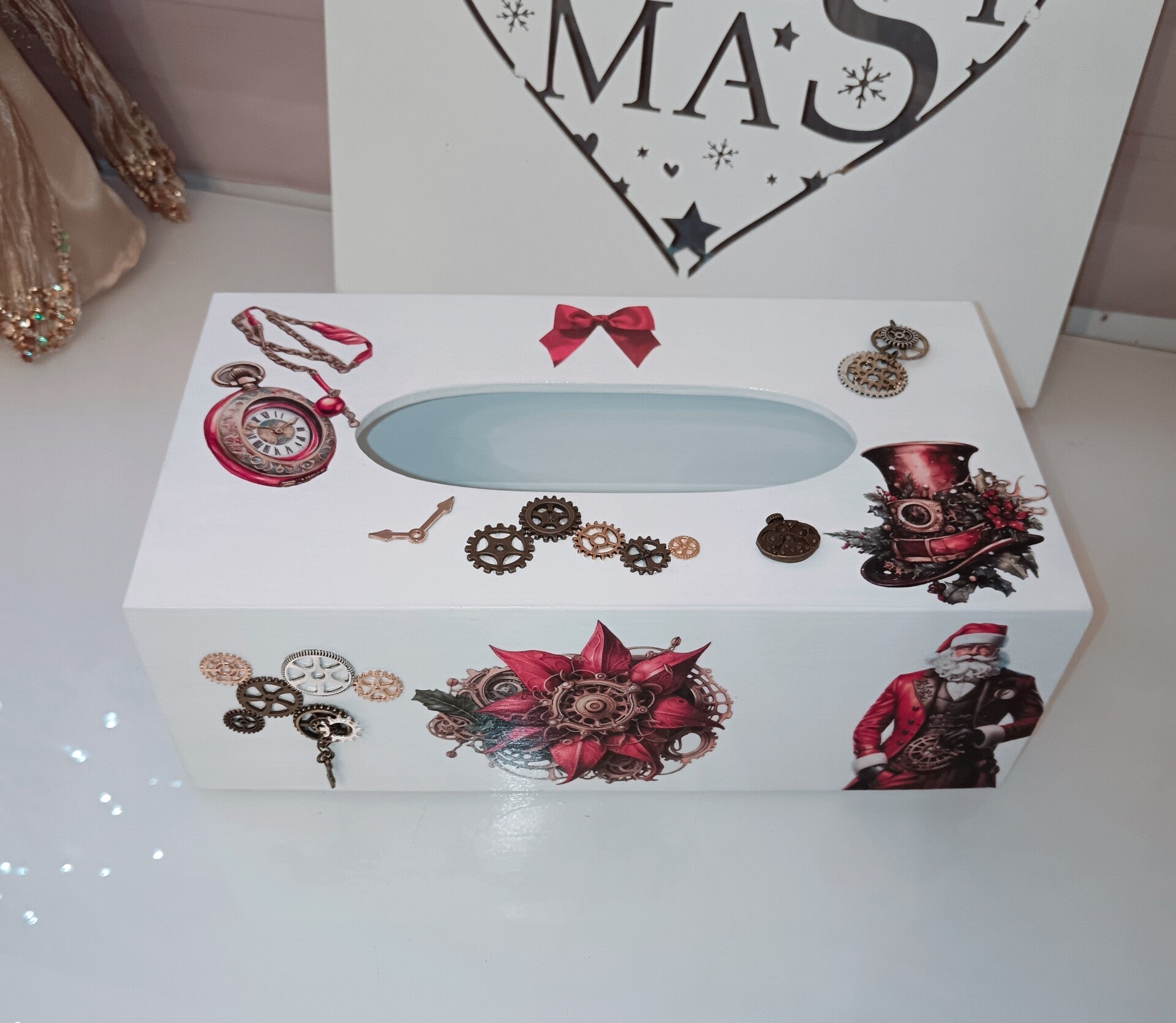 Boîte à mouchoirs en bois originale mélangeant Noël avec le style Steampunk. Une boîte qui sera également une belle décoration pour les fêtes de fin d'années et pourquoi ne pas la laisser en place toute l'année. Décorée à la main, elle est protégée par plusieurs couches de vernis. Création artisanale et unique.
