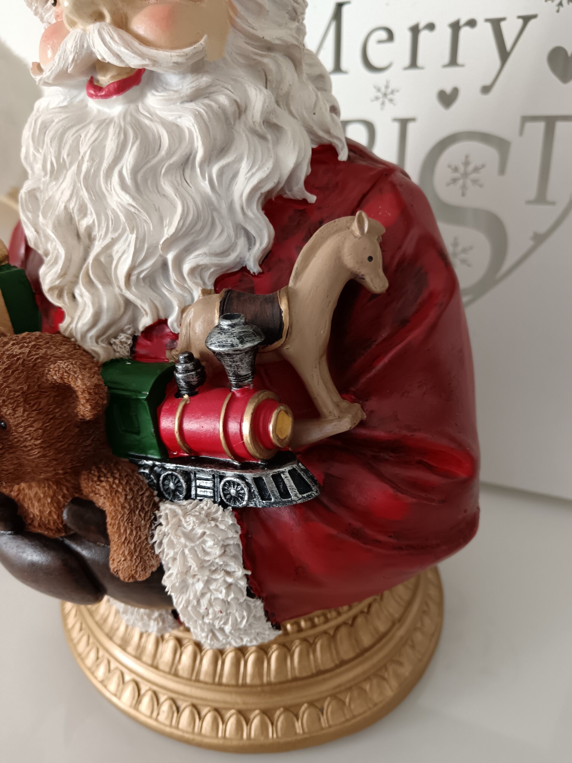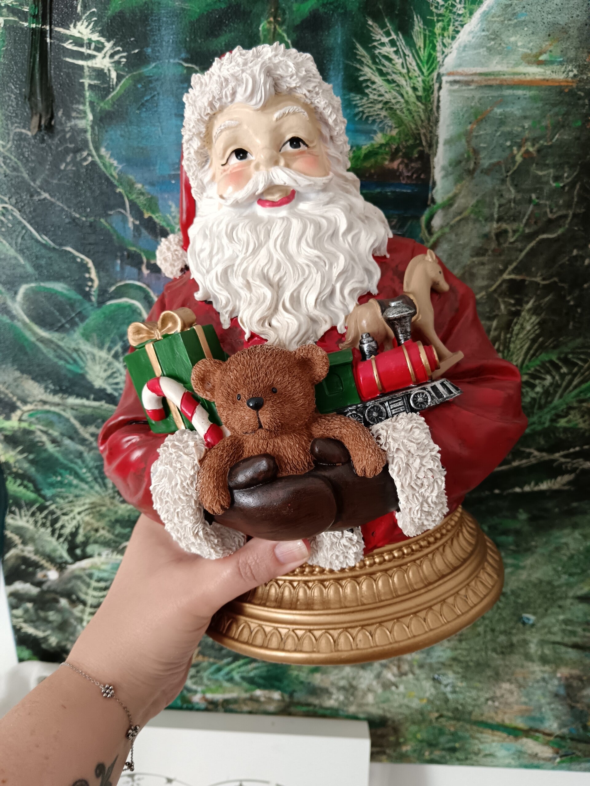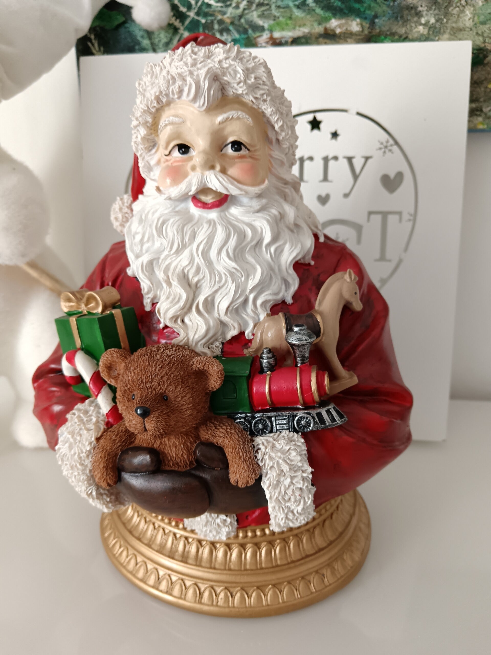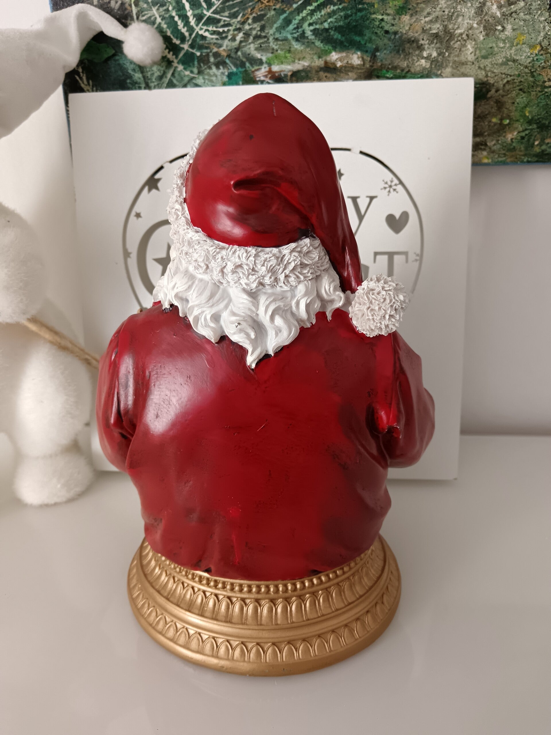 Magnifique buste pour votre décoration de Noël. Couleurs traditionnelles et effet Noël d'Antan en font une décoration qui enchantera votre maison. En polyrésine.