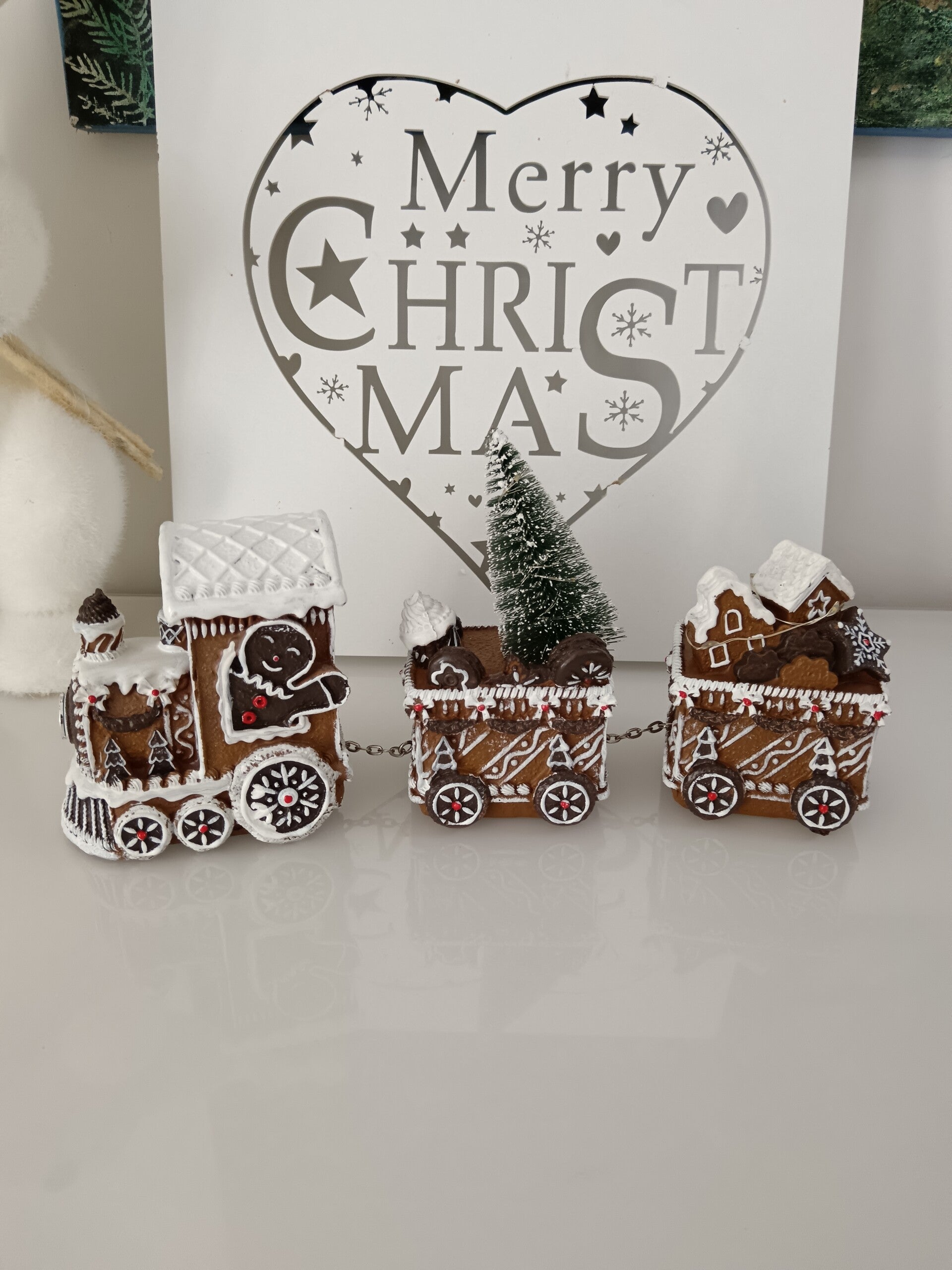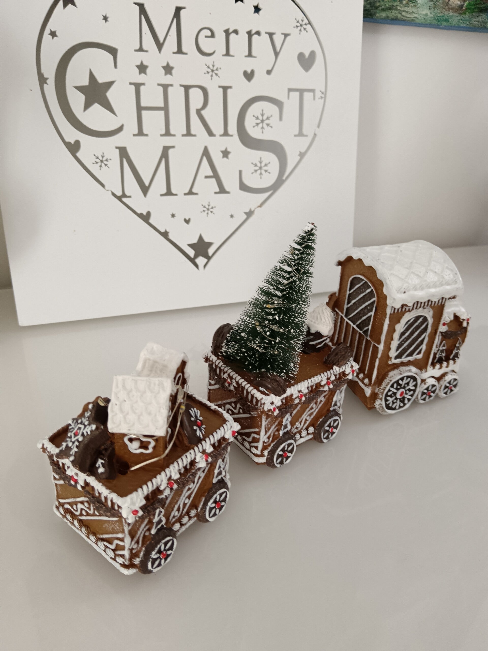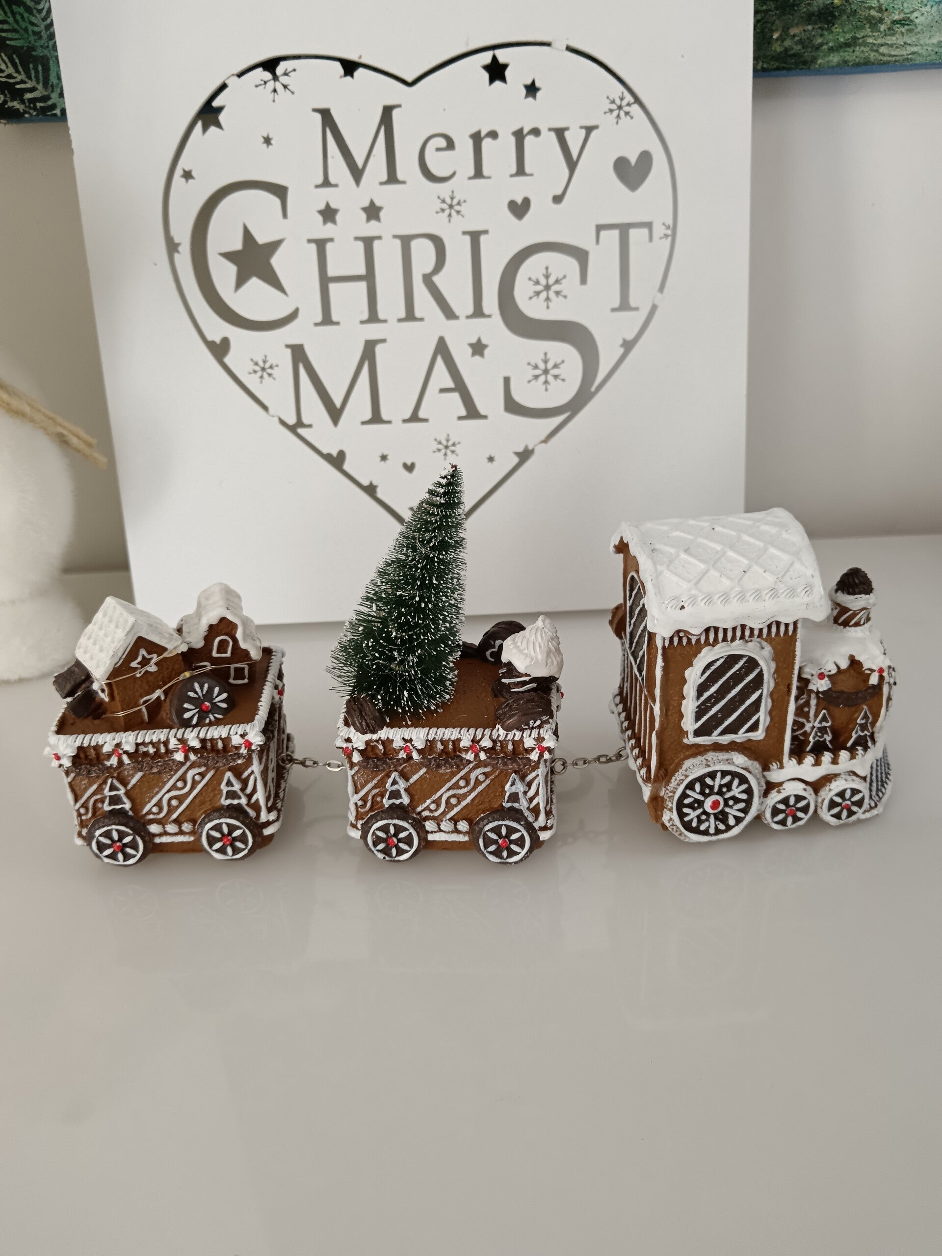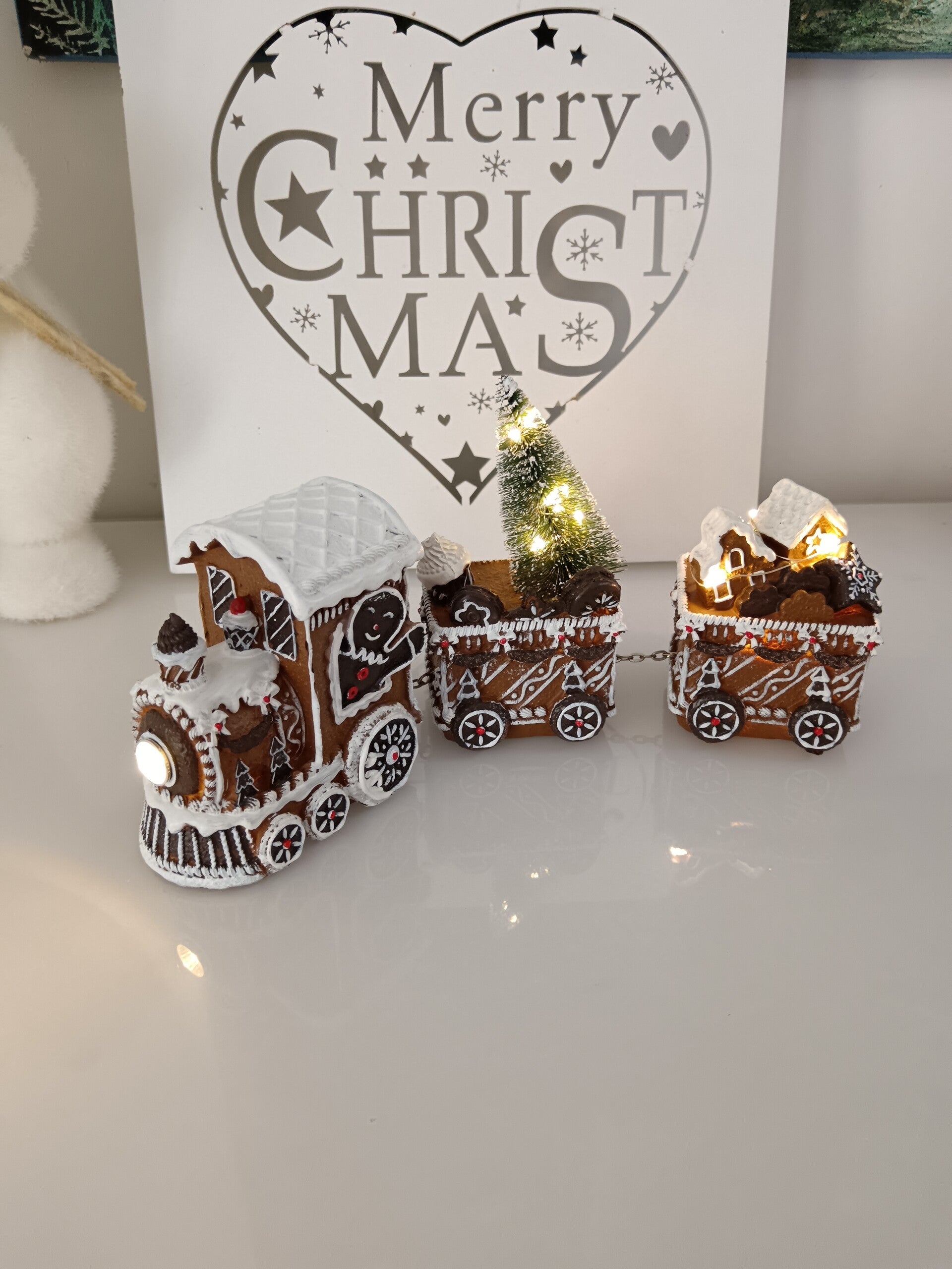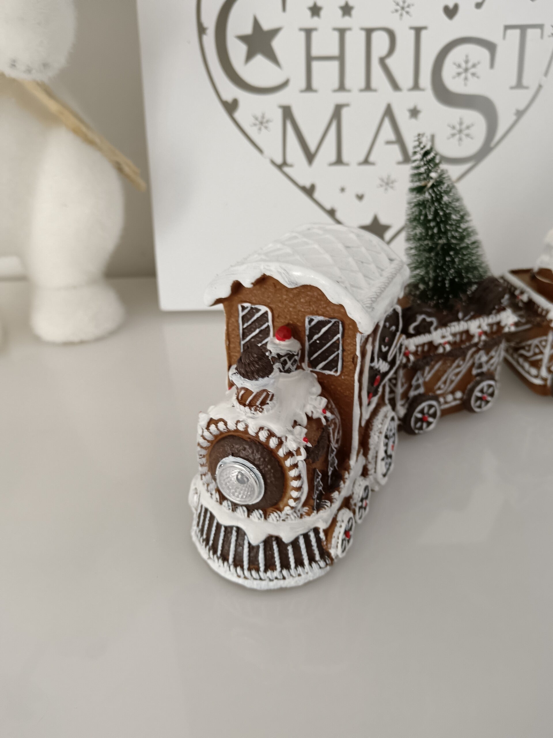 Joli train imitation pain d'épices pour un Noël toute en gourmandise avec de nombreux détails blanc effet glaçage royal. En polyrésine et LED.