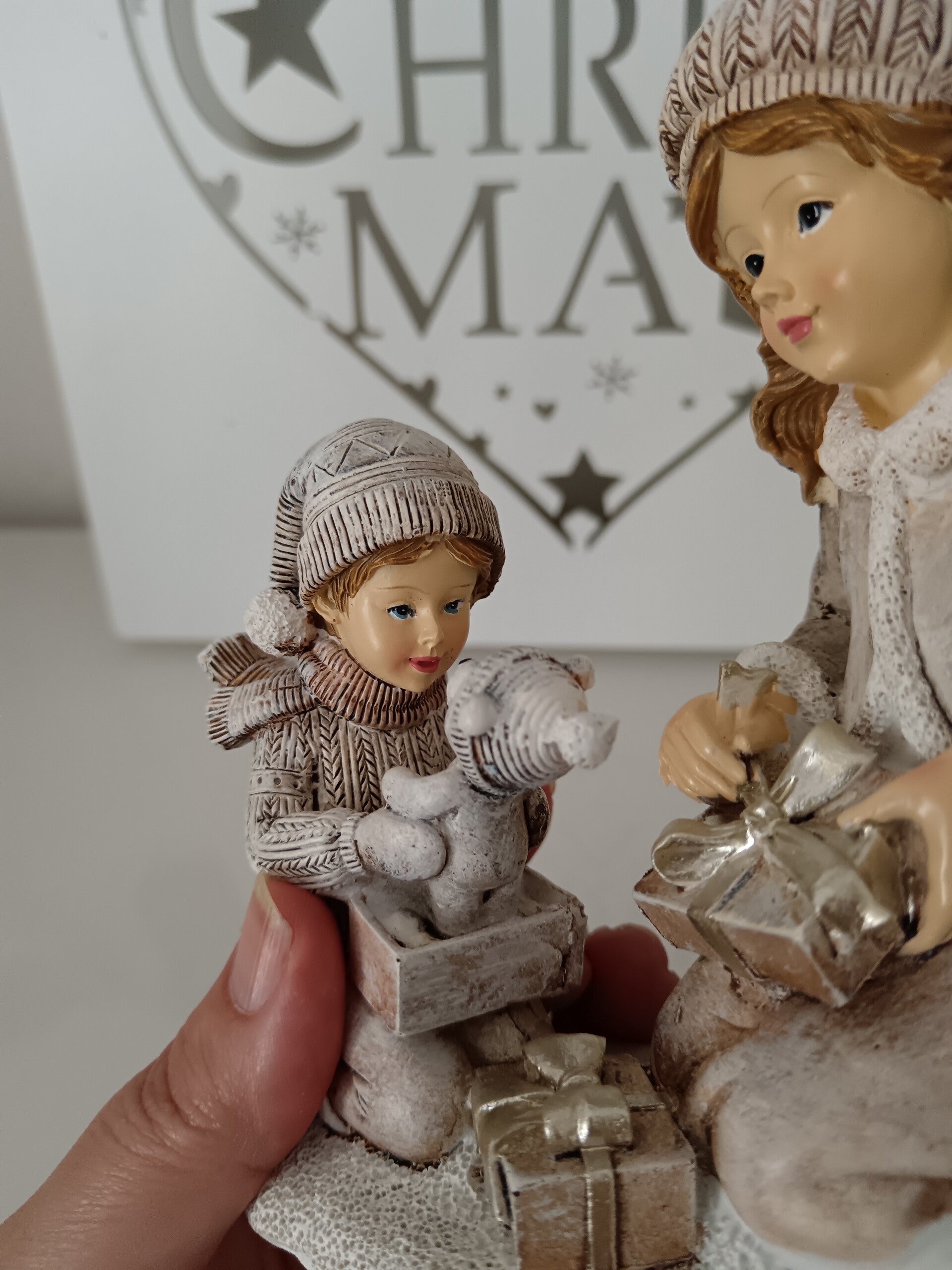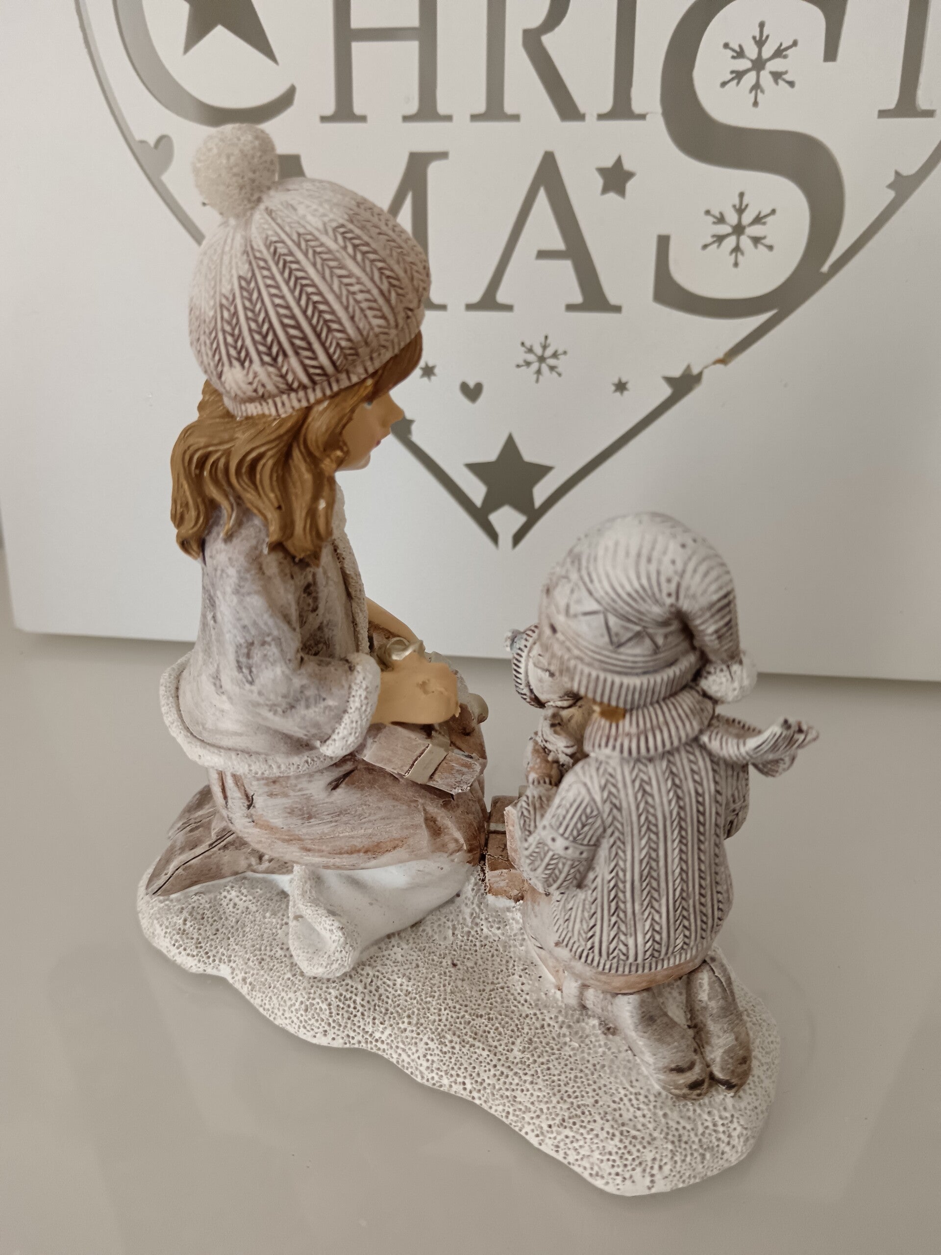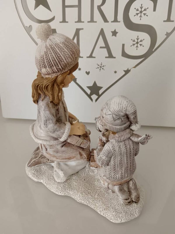 Une belle scène de Noël représentant des enfants en train de déballer leurs cadeaux. Les couleurs douces en font une décoration idéale pour un style Shabby chic. En polyrésine.