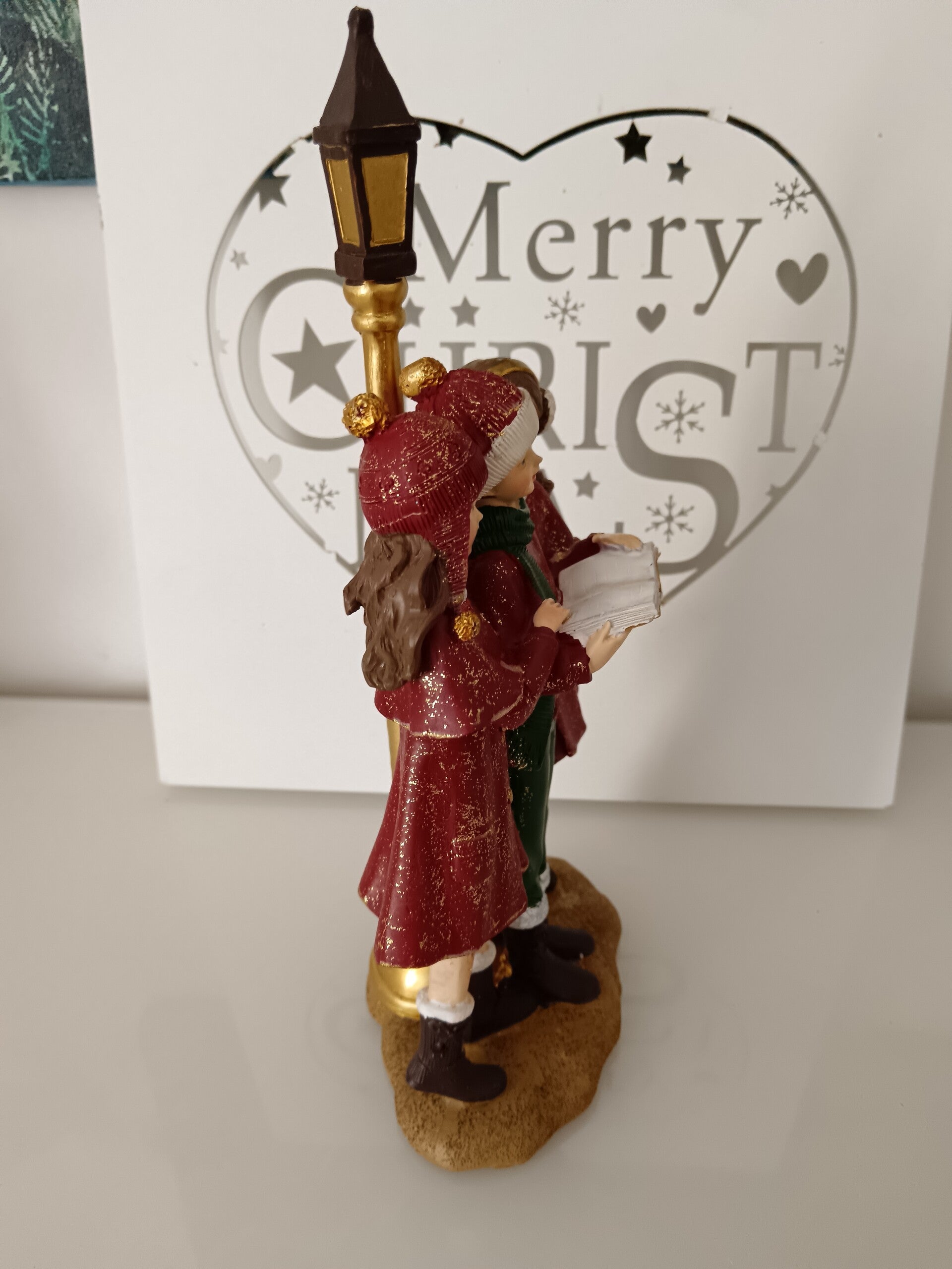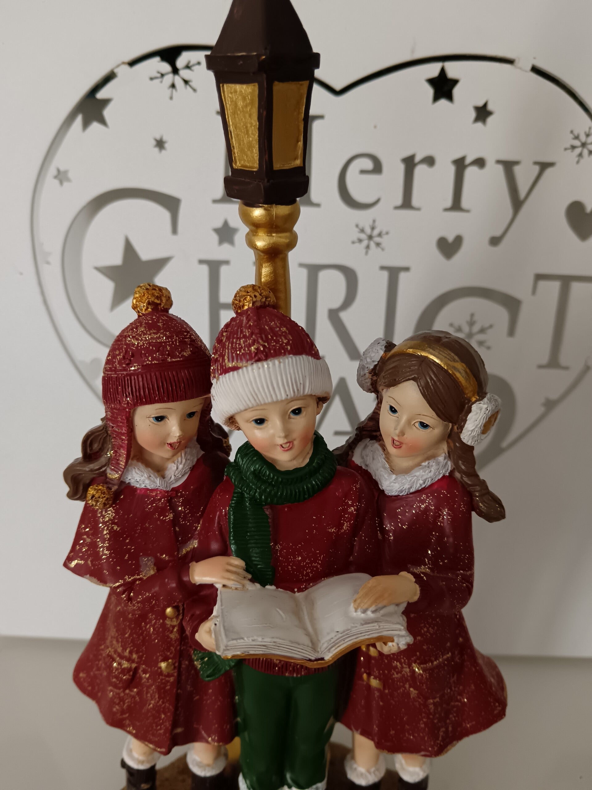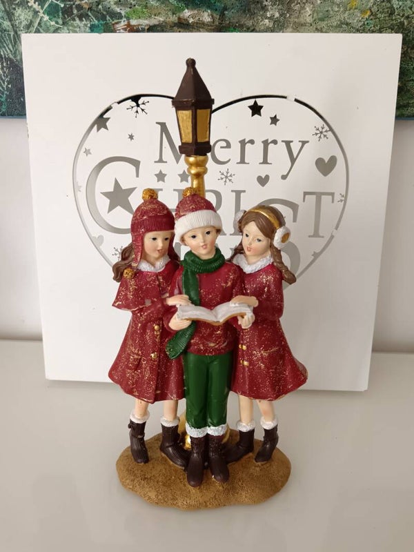 Ces enfants entrain de chanter, aux couleurs traditionnelles, sont une magnifique décoration de Noël. En polyrésine.