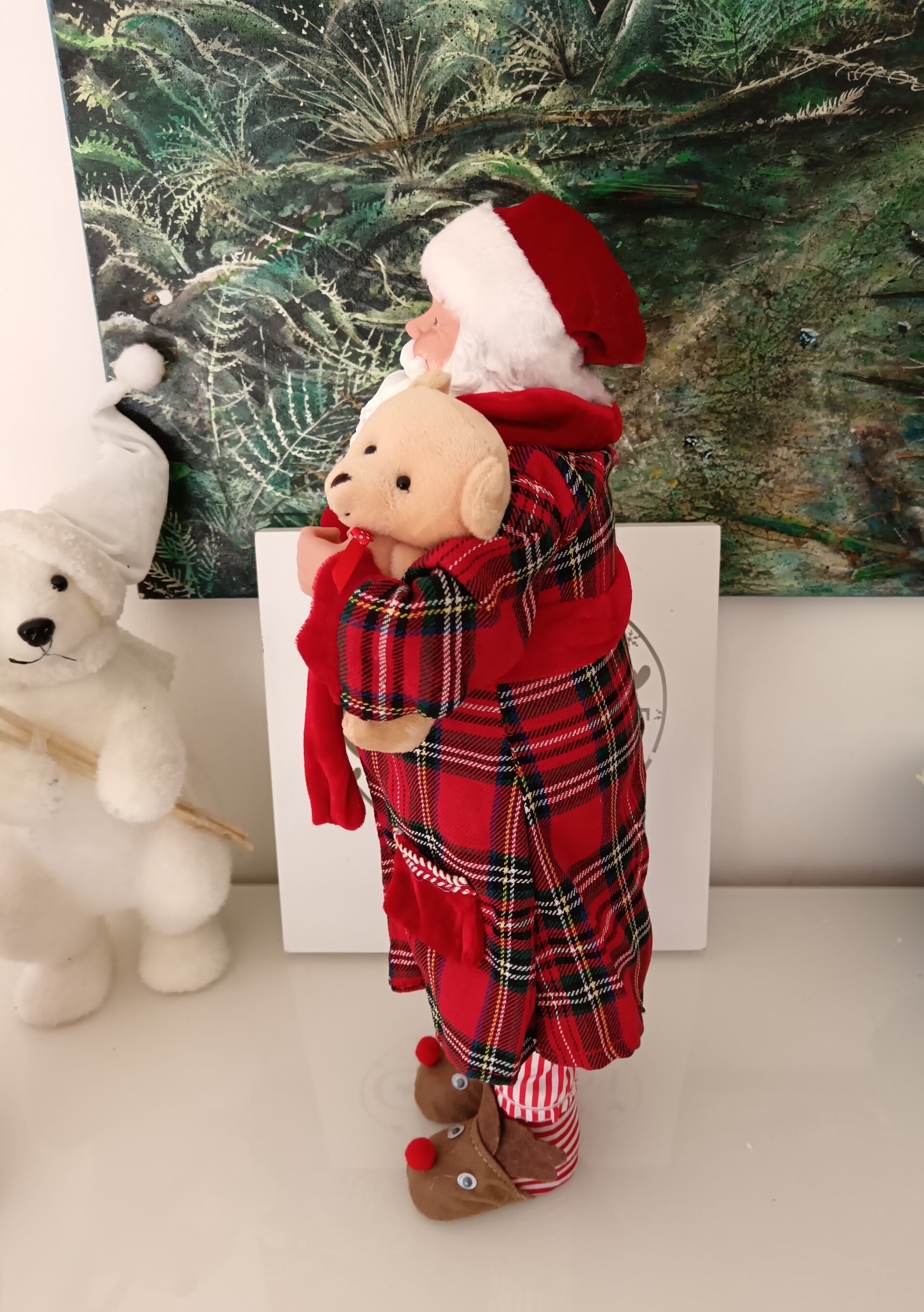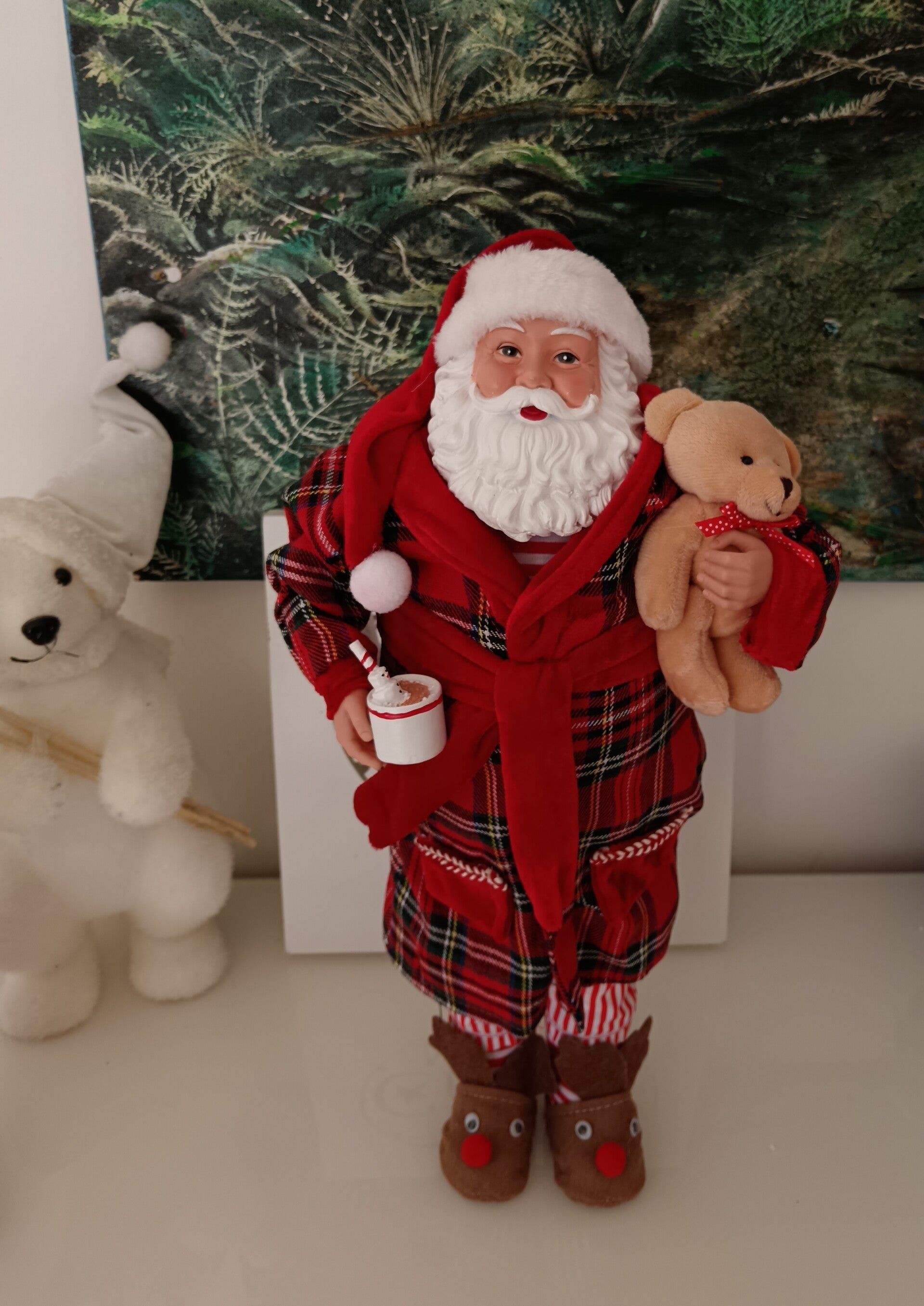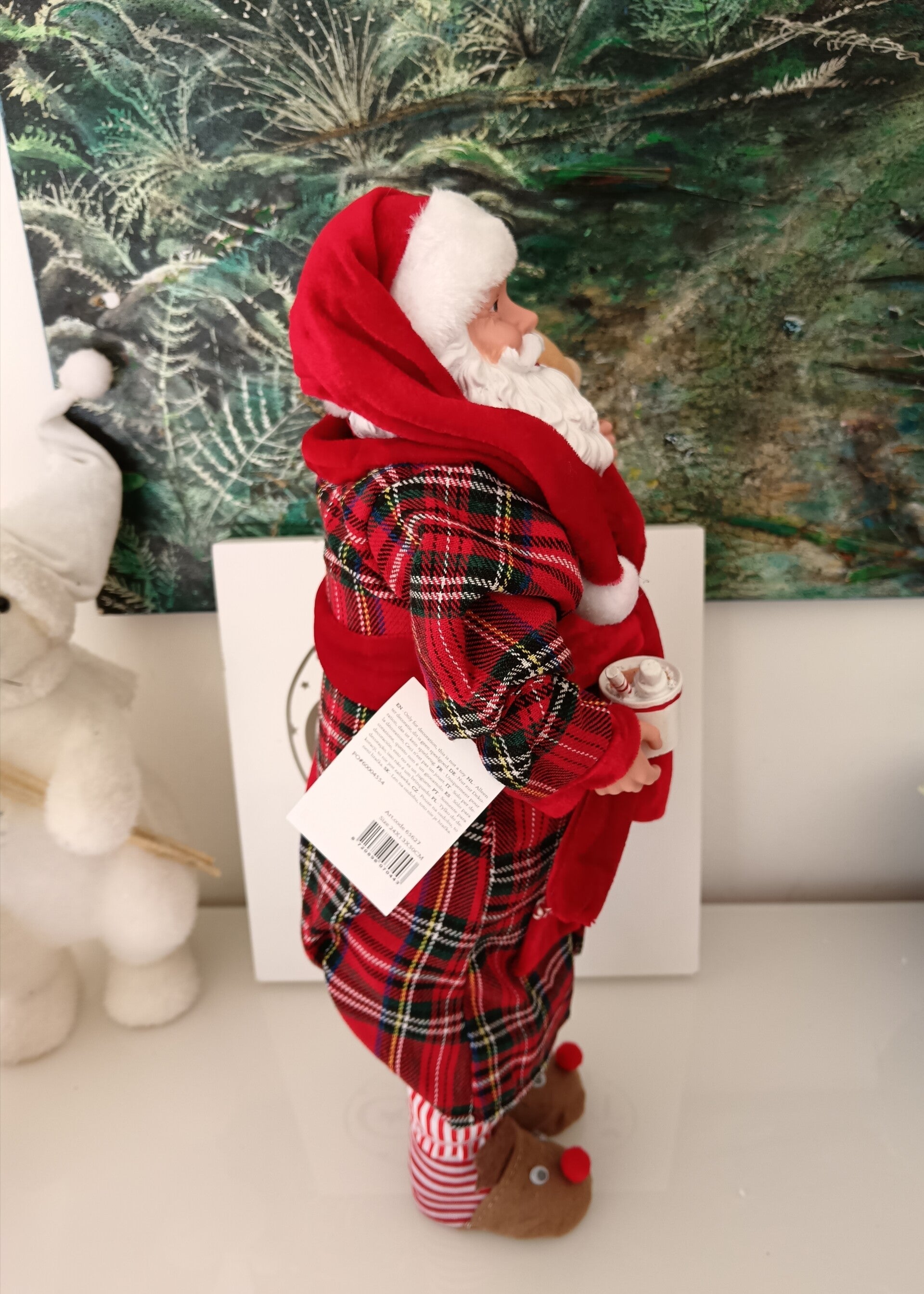 Ce grand Père-Noël de 50 cm, a revêtu sa robe de chambre douillette, mis ses pantoufles renne et s'est préparé à passer une soirée détendue. En polyuréthane et tissu.