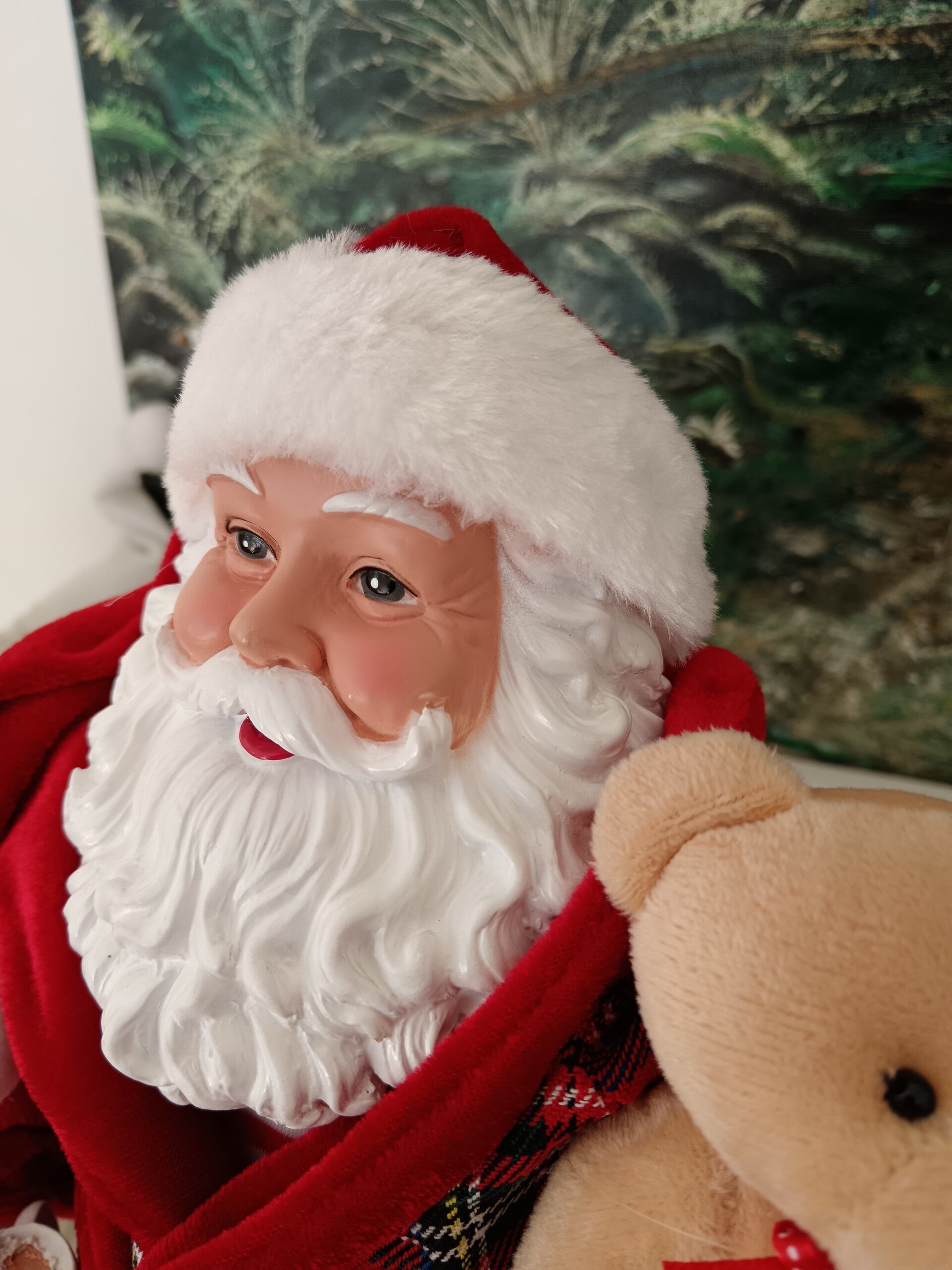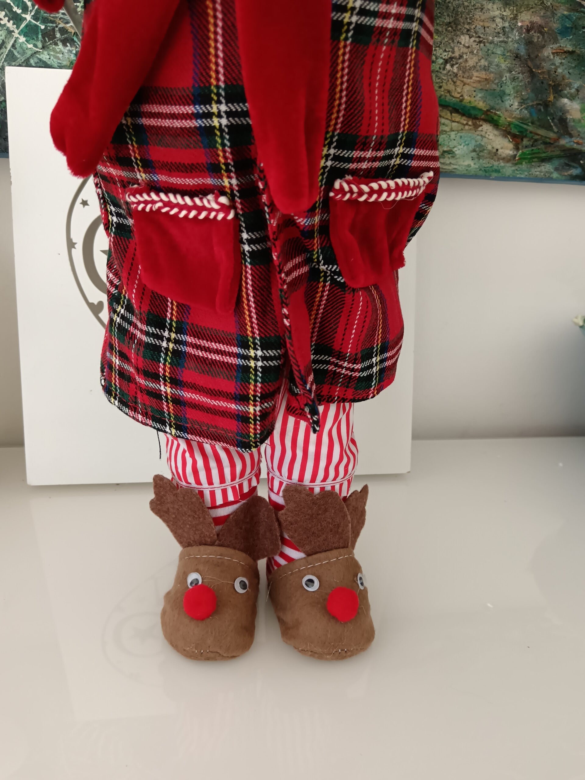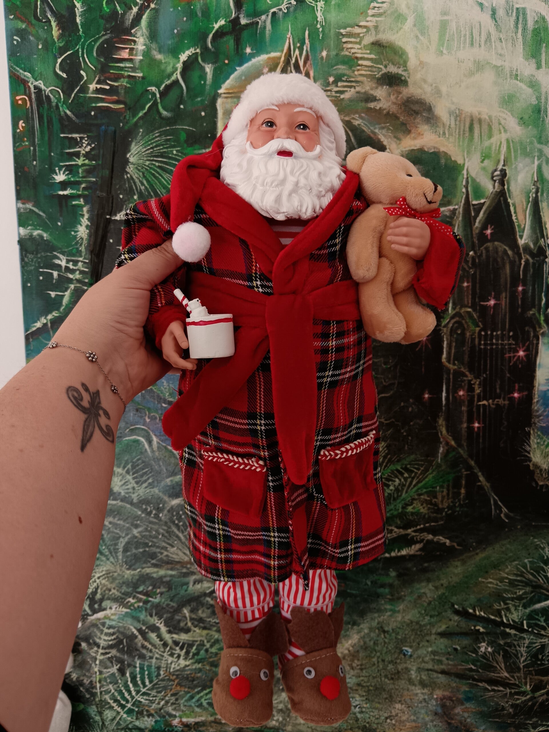 Ce grand Père-Noël de 50 cm, a revêtu sa robe de chambre douillette, mis ses pantoufles renne et s'est préparé à passer une soirée détendue. En polyuréthane et tissu.