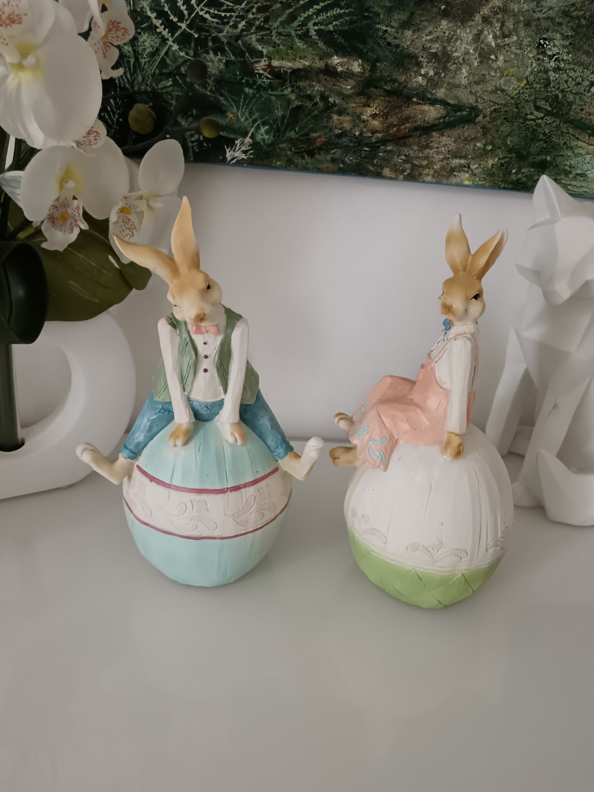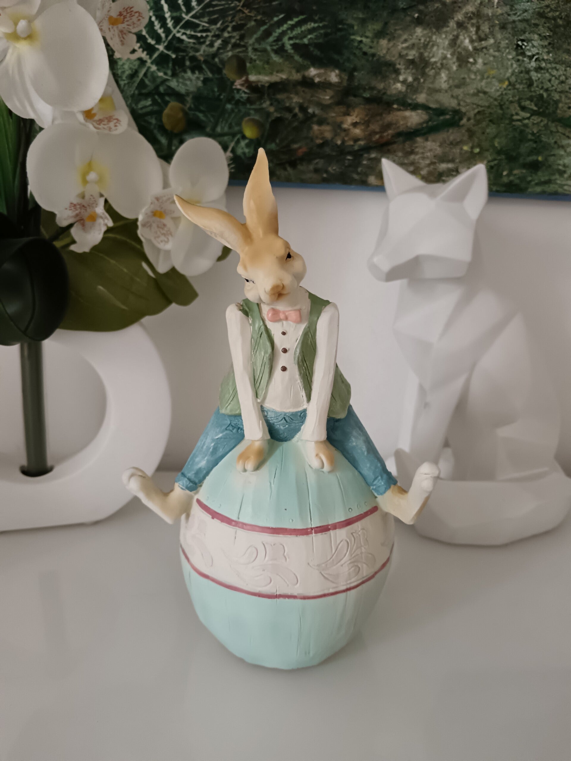 Belle décoration pour Pâques aux couleurs pastels. Ce lapin semble bien s'amuser en haut de son oeuf. Décoration que vous pouvez laisser en place tout le printemps. En polyrésine.