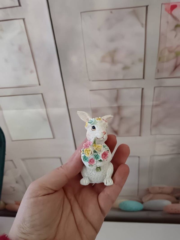 Petite suspension avec une lapine tenant un bouquet de fleurs. Parfaite pour votre arbre de Pâques ou à poser sur un meuble. Son côté printanier vous permet de la garder en place toute la saison. En polyrésine.