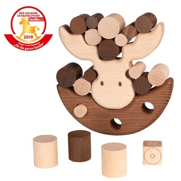 Cet élan équilibriste est vraiment très original! On lance le dé à tour de rôle et le rondin de bois correspondant doit être posé sur l'élan - ce qui le fait vaciller. A-t-on besoin de couleurs lorsqu'un jouet possède un design si réussi?