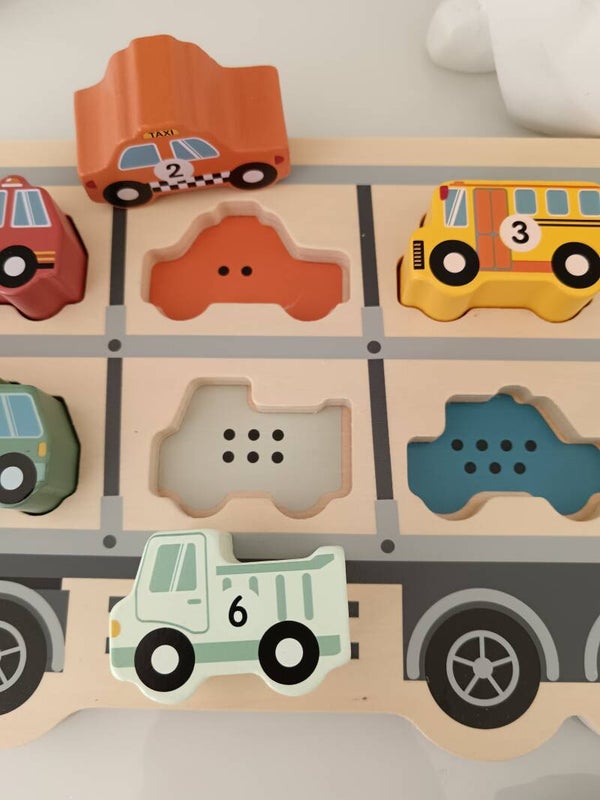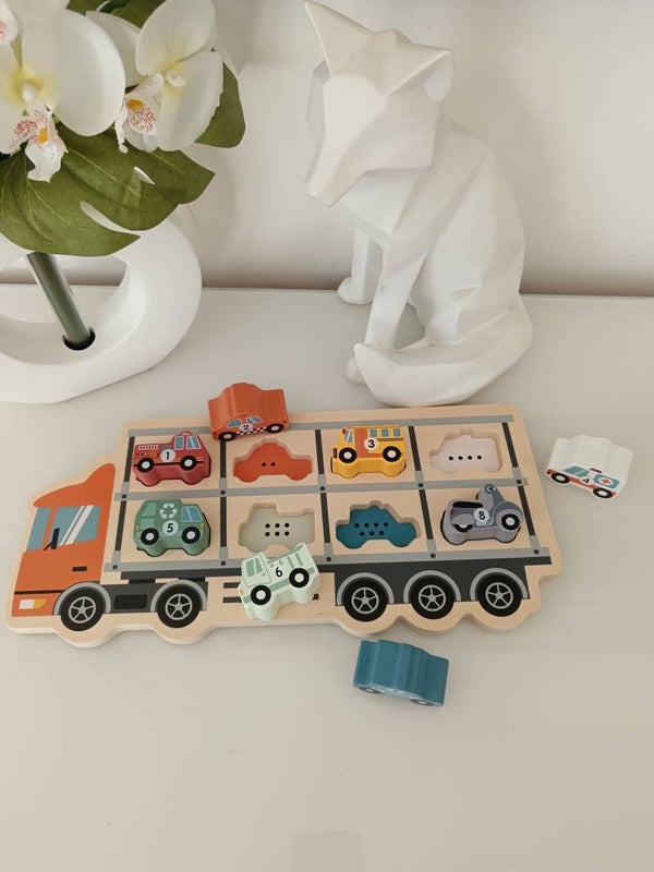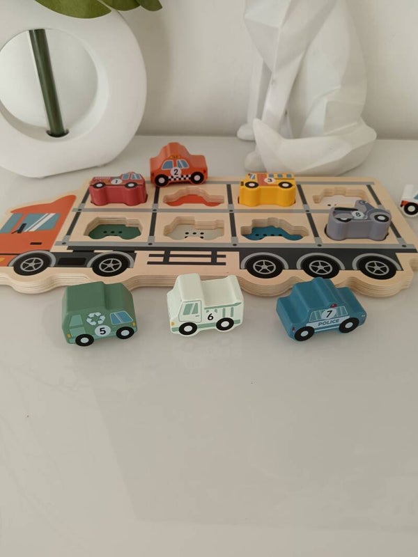 Puzzle Camion Porte-Voitures en bois avec 8 pièces représentant des véhicules à encastrer. Chaque véhicule est numéroté, facilitant l'apprentissage des chiffres. Emplacement de chaque véhicule indiqué sur le puzzle pour une expérience interactive. L'enfant peut également utiliser les véhicules pour jouer sur un circuit et laisser libre cours à son imagination.