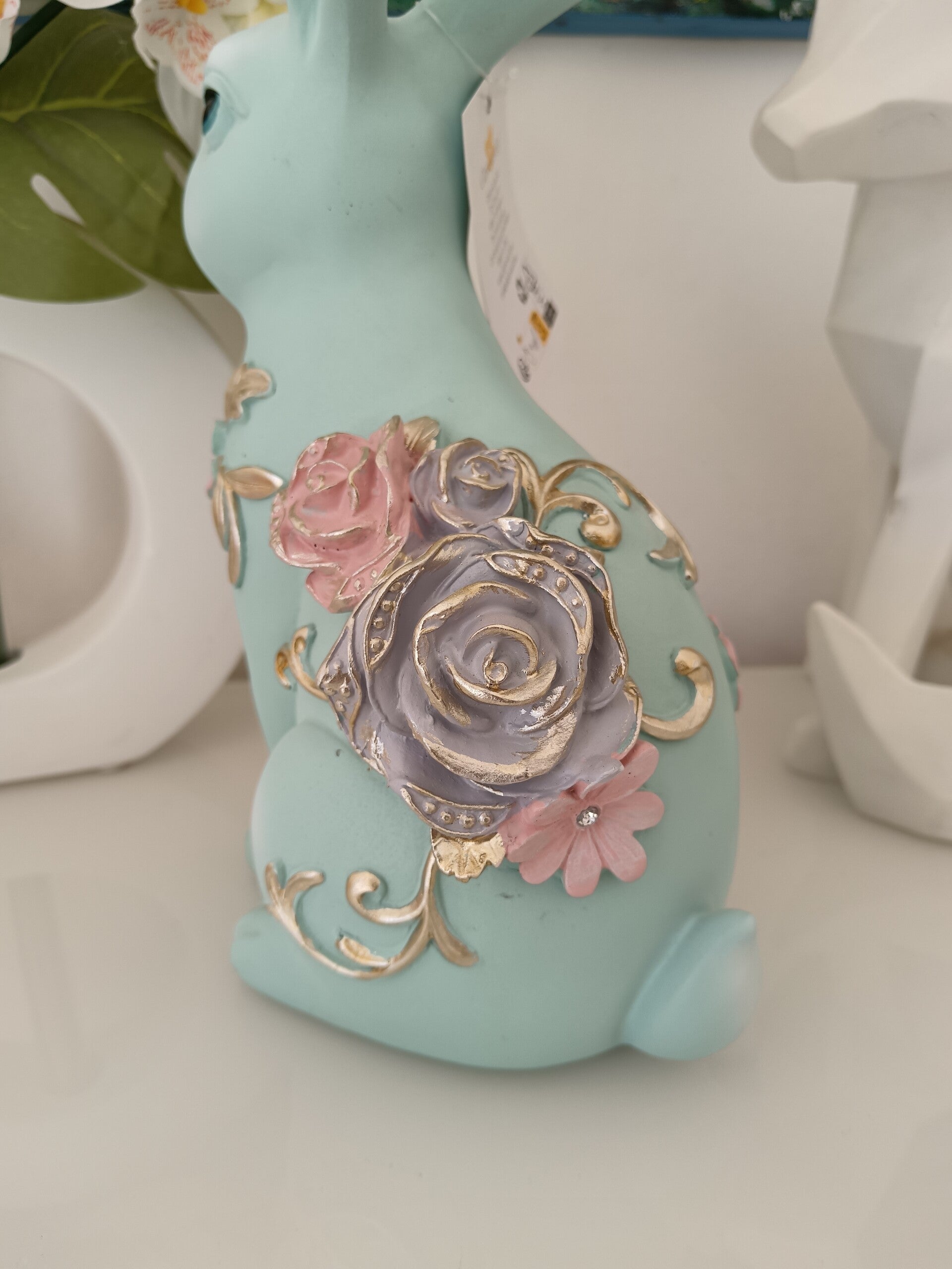 Magnifique lapin bleu avec de belles fleurs en relief, certaines sont décorées d'un strass pour faire le coeur de la fleur. Il apportera une touche d'élégance à votre décoration, que ce soit pour Pâques ou pour le printemps. En polyrésine.