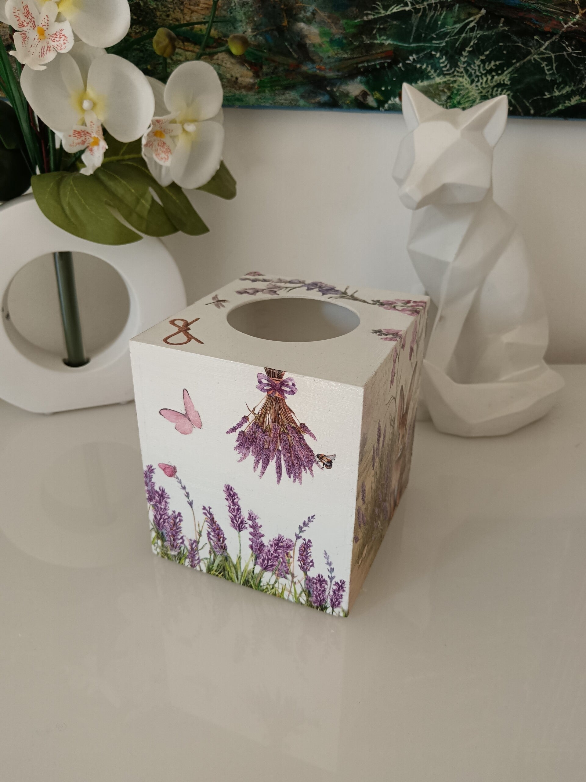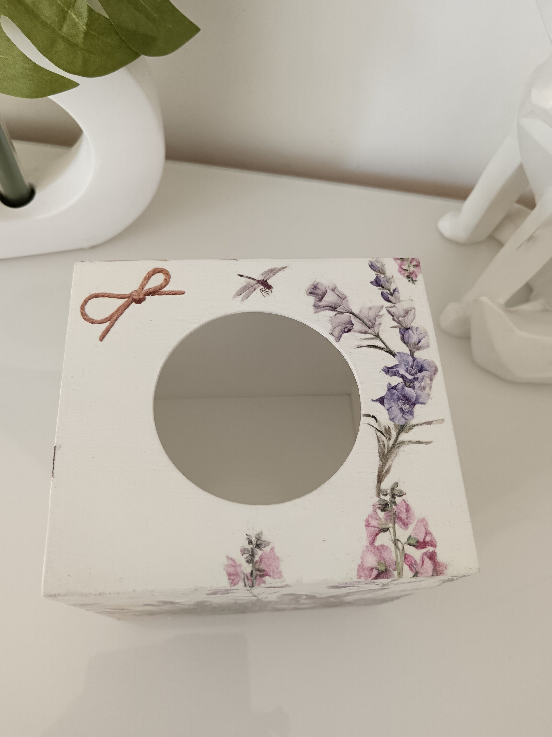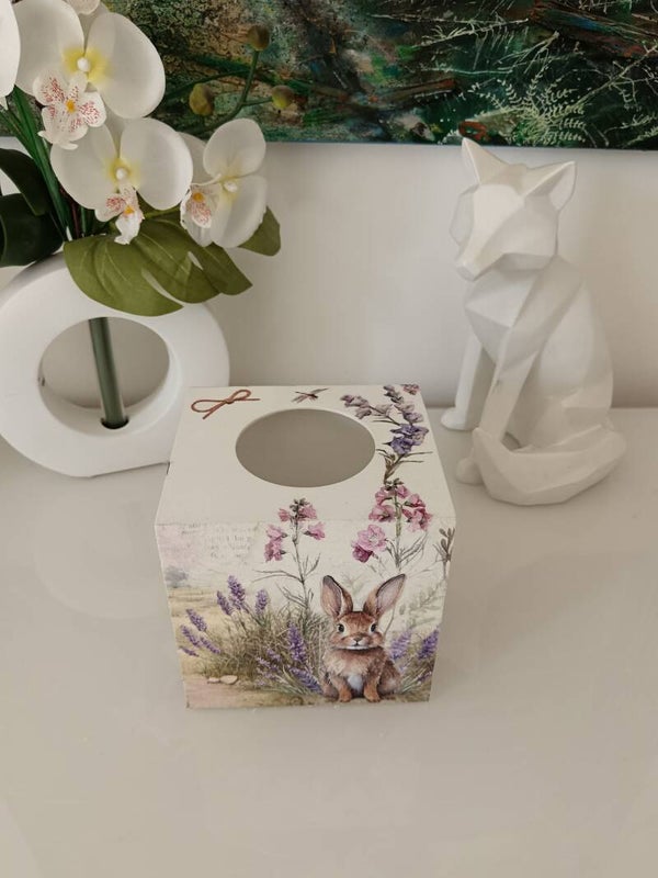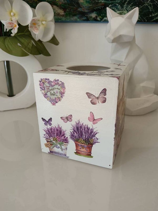 Boîte à mouchoirs en bois carrée, moins encombrante que la boîte rectangulaire elle est parfaite pour les petits espaces comme un bureau, une salle de bain... Décorée à la main avec la technique du serviettage. Cadeau original pour la fête des mères, un anniversaire, Noël...