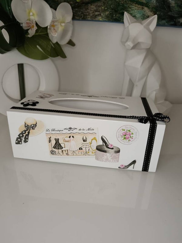 Boîte à mouchoirs en bois décorée à la main avec la technique du serviettage. Aux couleurs passe-partout et élégante elle sera parfaite comme objet de décoration dans une chambre ou un salon. Elle est protégée par deux couches de vernis. Création artisanale et unique.