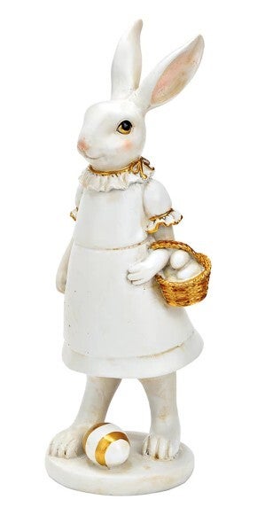 Grande lapine élégante et chic avec de beaux détails dorés. Elle est parfaite pour votre décoration de Pâques et assi pour le printemps. En polyrésine.