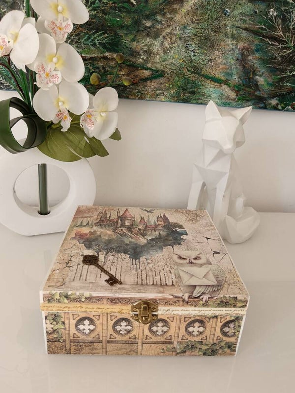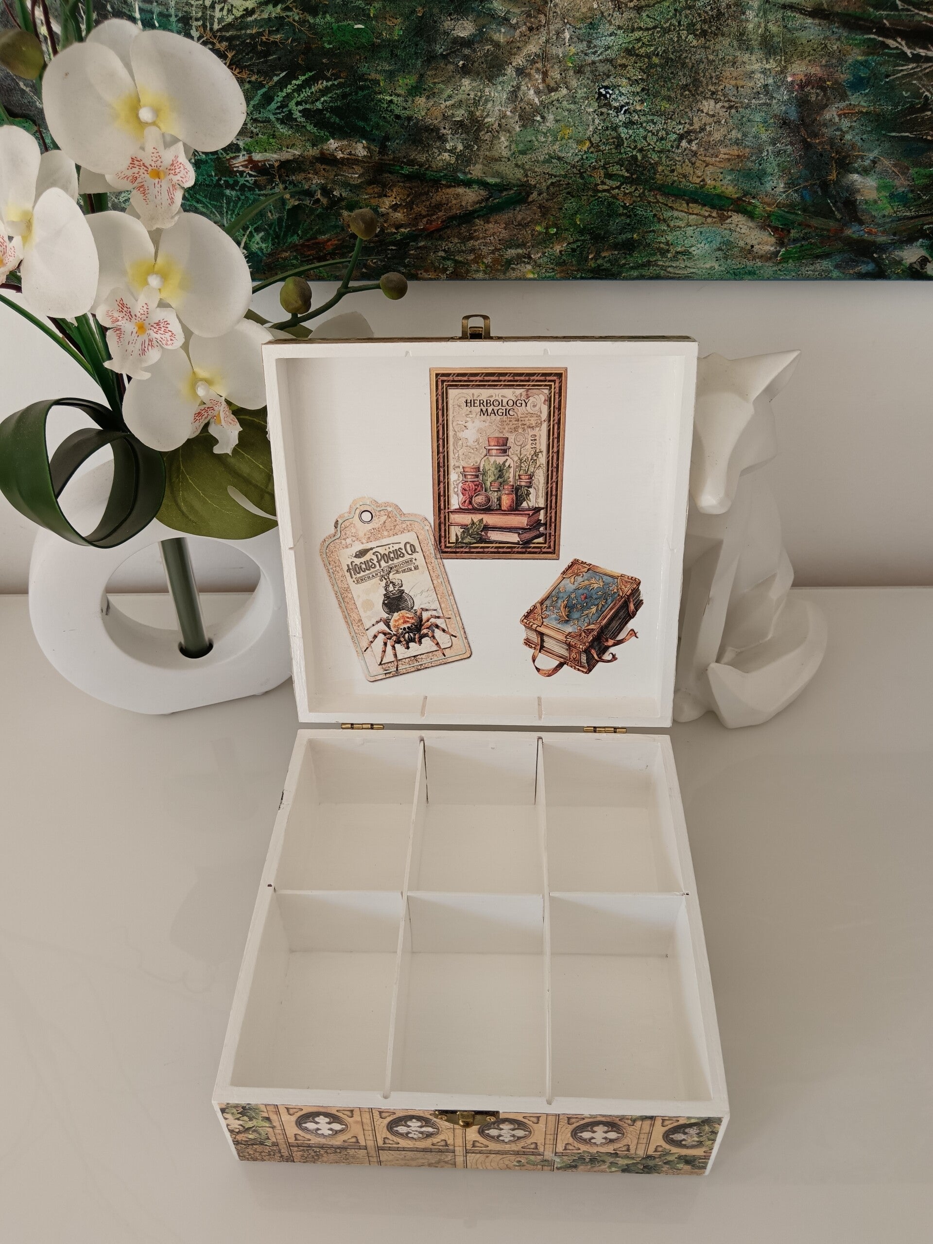 Boîte à 6 compartiments dans le style école de magie. Parfaite pour stocker les sachets de thé, mais aussi des fioles d'huiles essentielles, une collection de pierres, des bijoux, des perles... Elle est protégée par deux couches de vernis. Création artisanale et unique.