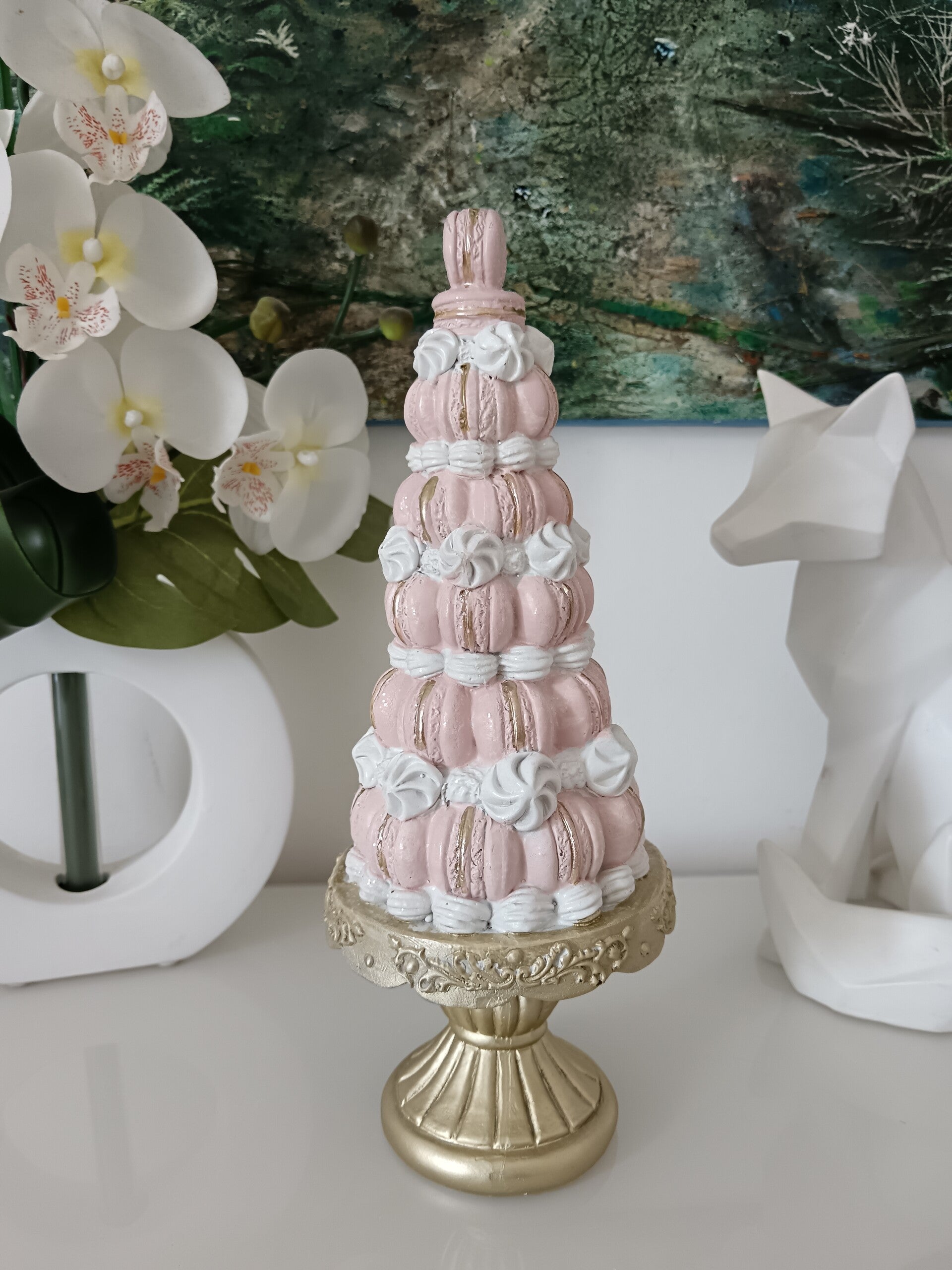 Apportez une touche de gourmandise chic à votre intérieur avec cette élégante figurine décorative en forme de gâteau de macarons rose. Avec ses détails raffinés, ses nuances délicates et son socle doré ornementé, elle est parfaite pour sublimer une table, une vitrine ou une décoration de fête. Un véritable clin d’œil à l’univers sucré et raffiné de la pâtisserie française ! En polyrésine.