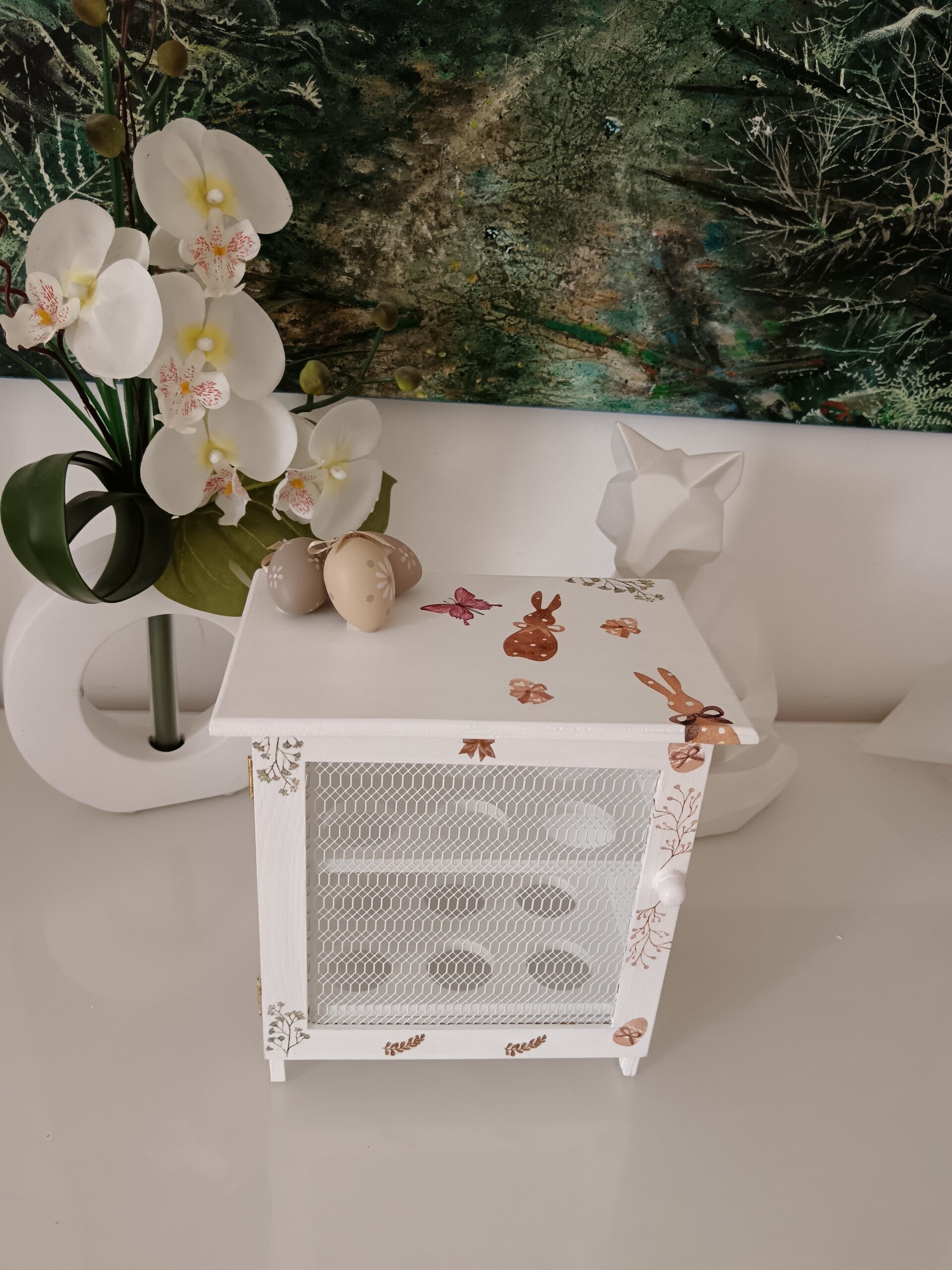 Apportez une touche de charme champêtre à votre cuisine avec cette adorable armoire à œufs en bois. Décorée à la main avec la technique du serviettage – lapins, fleurs, papillons et œufs de Pâques – elle est parfaite pour conserver vos œufs avec style. Son grillage fin laisse circuler l'air pour une meilleure conservation, tandis que son design raffiné en fait également un bel objet de décoration. Une pièce unique et pleine de douceur !