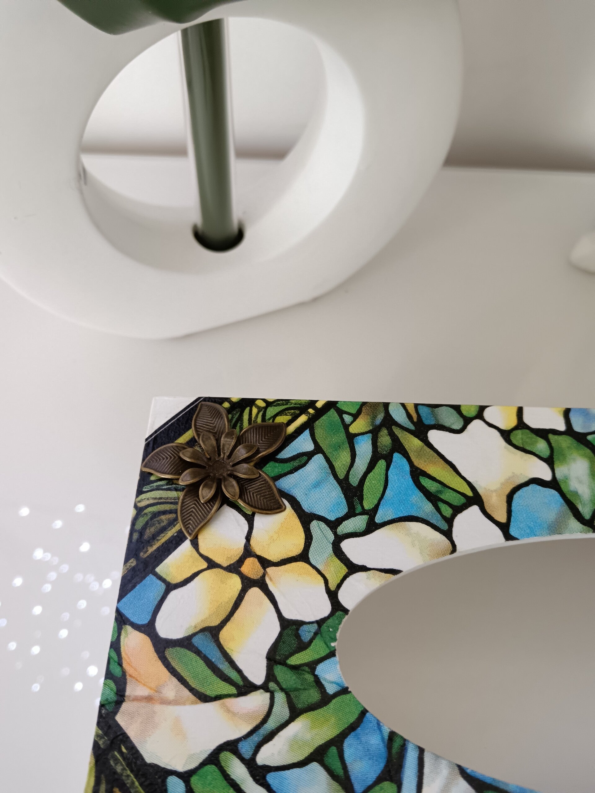Ajoutez une touche artistique à votre intérieur avec cette élégante boîte à mouchoirs en bois, décorée à la main avec la technique du serviettage. Son motif floral inspiré du vitrail mêle harmonieusement des tons de bleu, vert et blanc, pour une décoration raffinée et colorée.