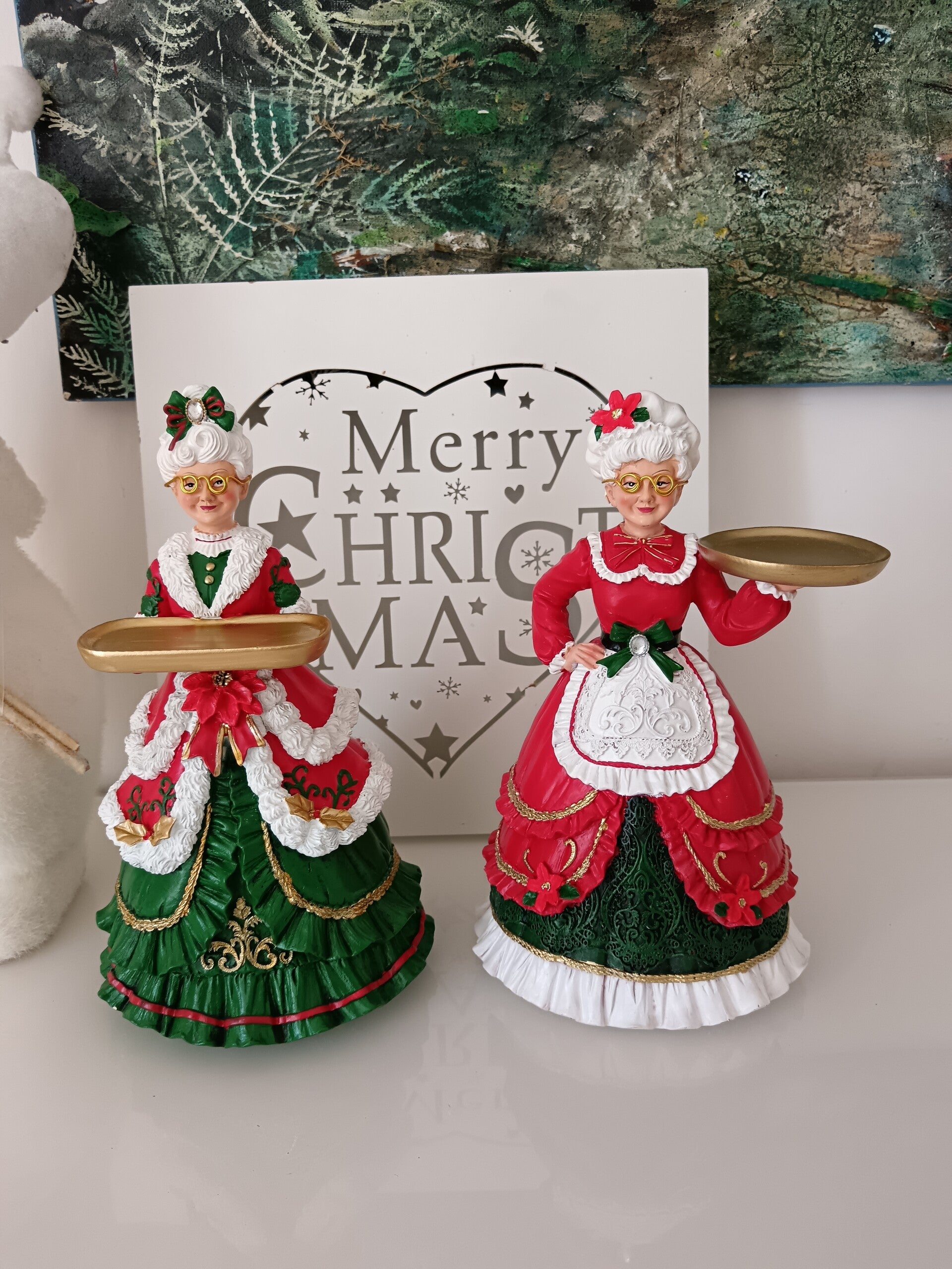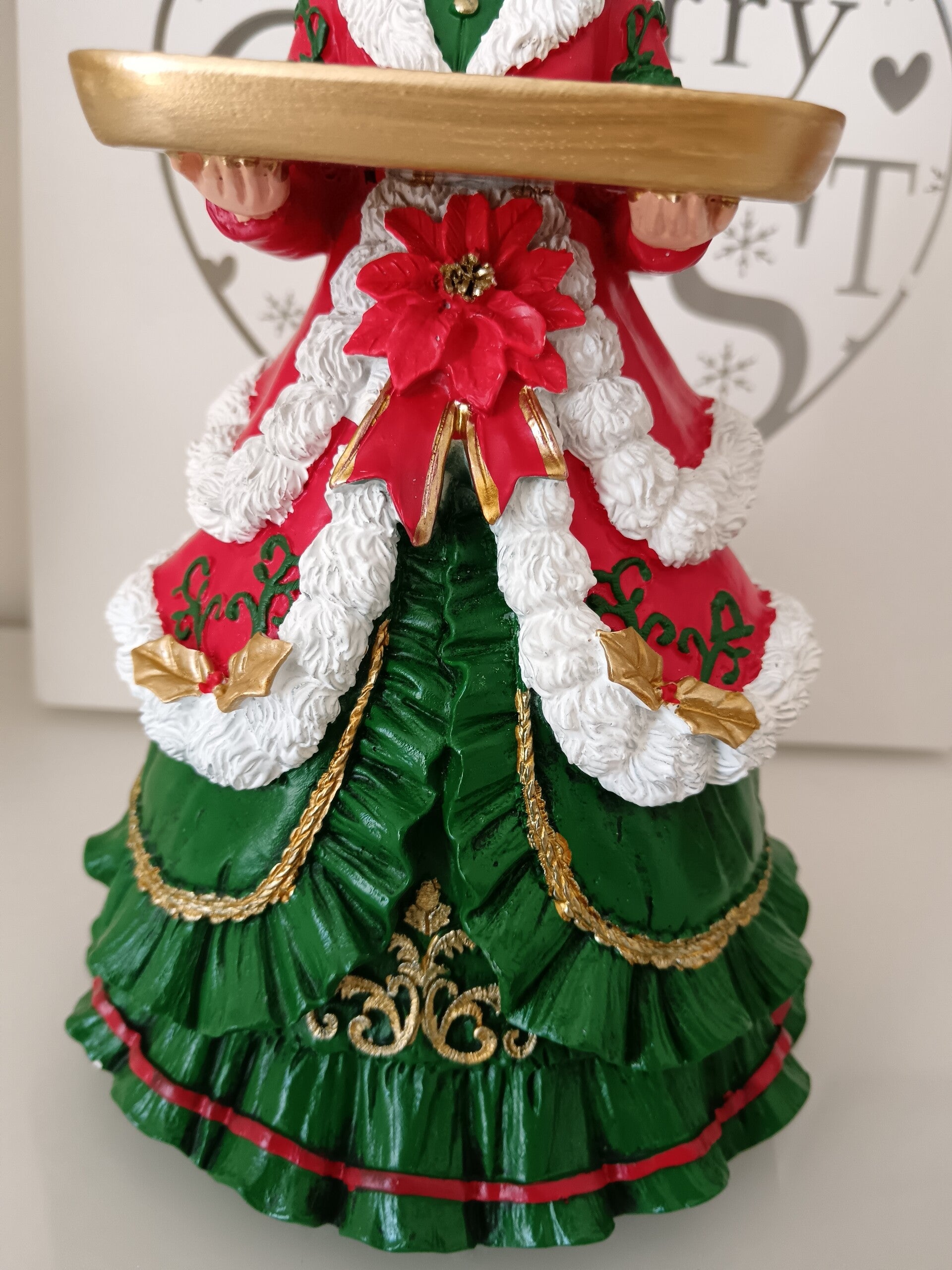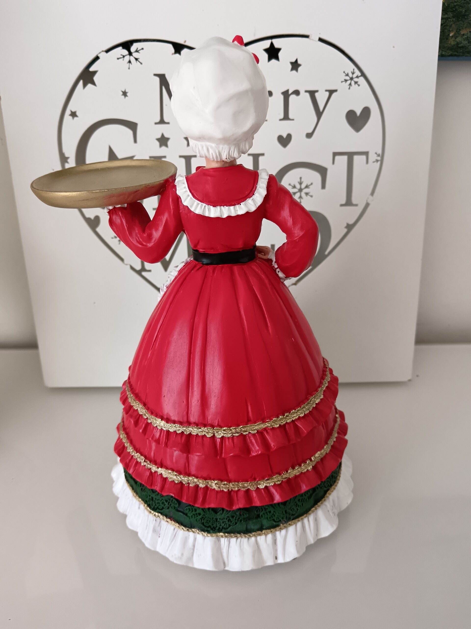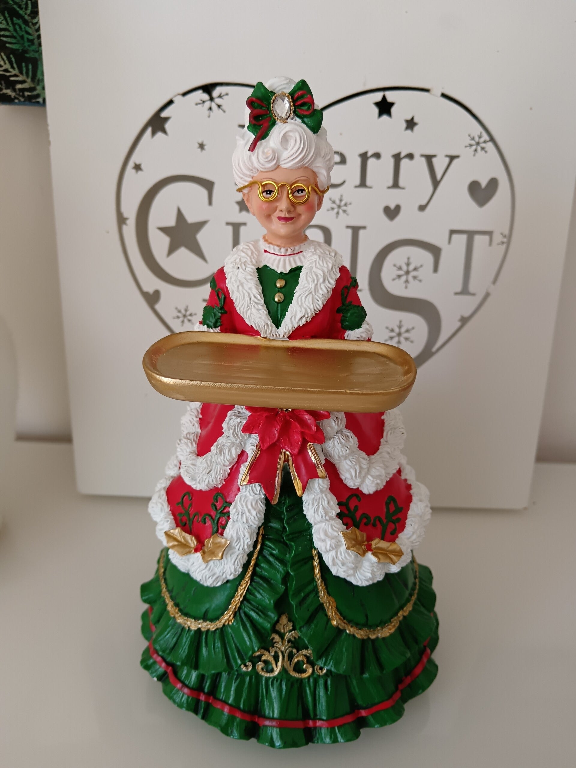 Apportez une touche festive et élégante à votre décoration avec cette charmante figurine de Mère Noël. Détails soignés, couleurs traditionnelles rouge, vert et doré, elle tient un plateau doré,idéale pour égayer une table ou une étagère pendant les fêtes ! En polyrésine.