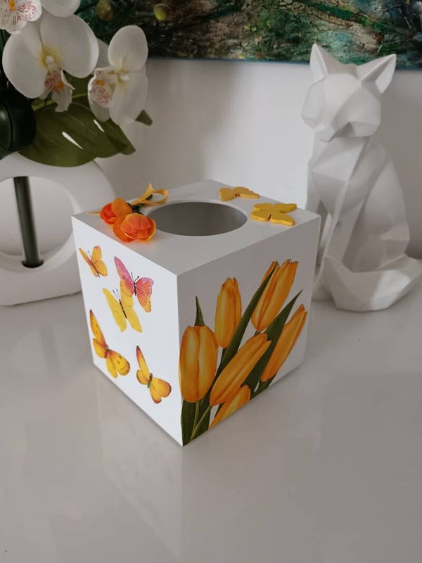 Apportez une touche de fraîcheur et de gaieté à votre intérieur avec cette élégante boîte à mouchoirs décorée à la main grâce à la technique du serviettage. Ornée de tulipes jaunes éclatantes et de papillons délicats, elle allie charme printanier et raffinement artisanal. Parfaite pour égayer une salle de bain, une chambre ou un salon !