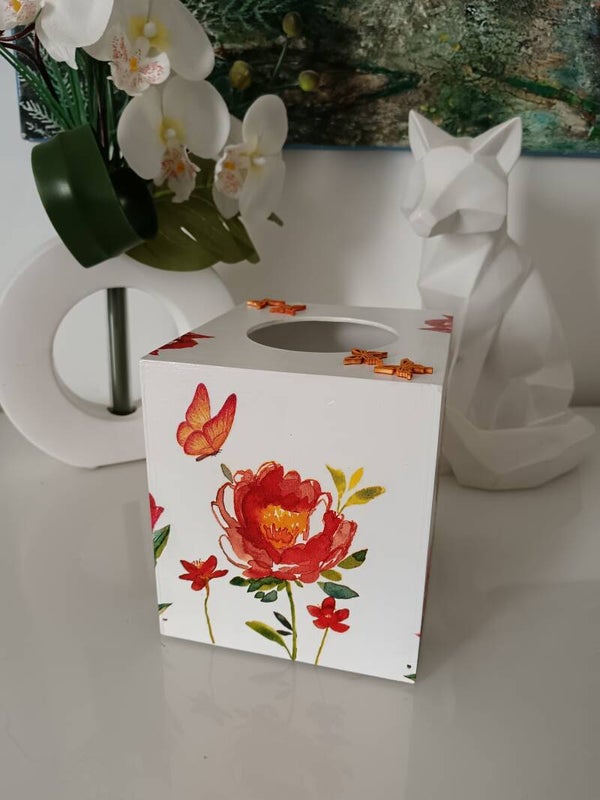 Apportez une touche florale et élégante à votre intérieur avec cette magnifique boîte à mouchoirs en bois décorée à la main grâce à la technique du serviettage. Ornée de tulipes éclatantes, de papillons délicats et de fleurs printanières, chaque pièce est unique et réalisée avec soin. Pratique et décorative, elle s’intègre parfaitement dans un salon, une salle de bain ou une chambre.