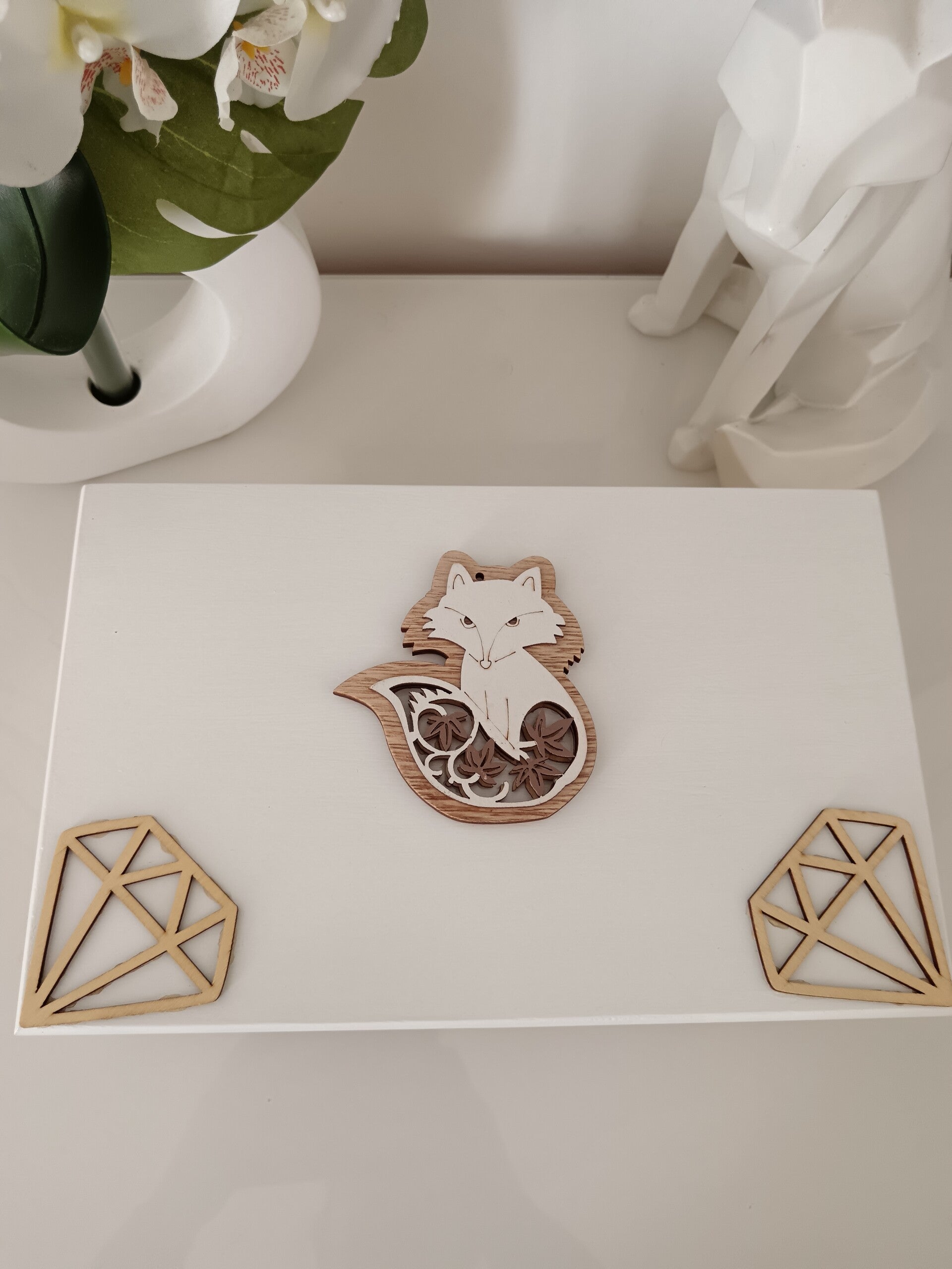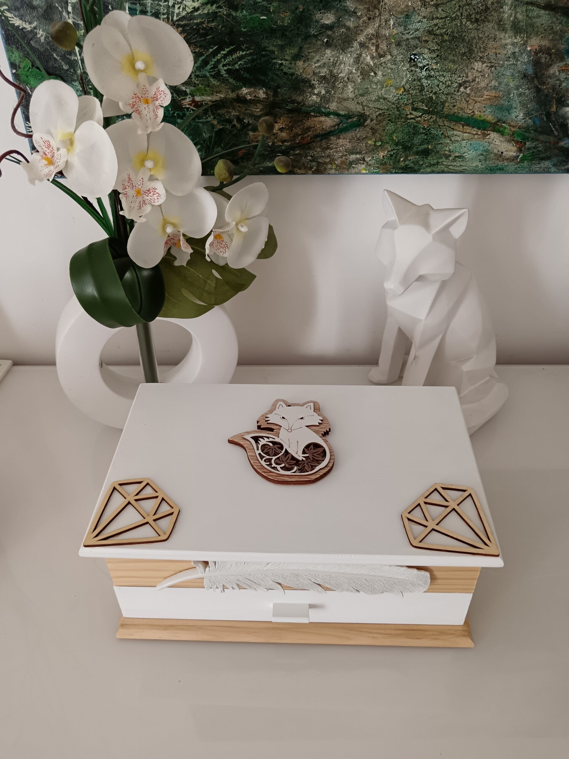 Apportez une touche de charme naturel à votre intérieur avec cette magnifique boîte à bijoux en bois. Son design raffiné mêle bois clair, blanc épuré et ornements en relief : un renard bohème, des diamants géométriques et des cœurs finement sculptés. Parfaite pour ranger vos bijoux et petits trésors, elle allie praticité et décoration avec élégance. Un cadeau original et poétique, à offrir ou à s’offrir ! Création artisanale et unique.