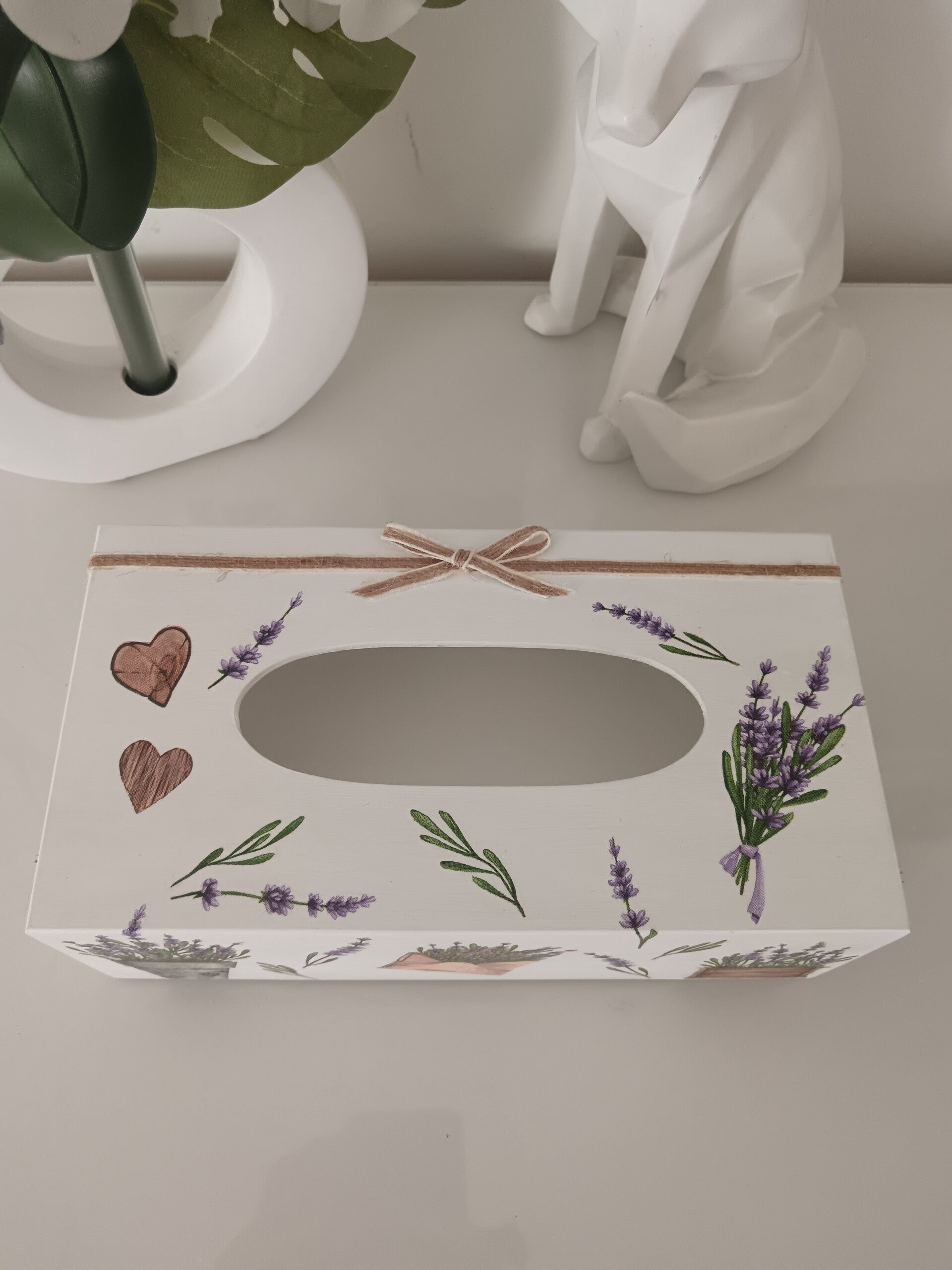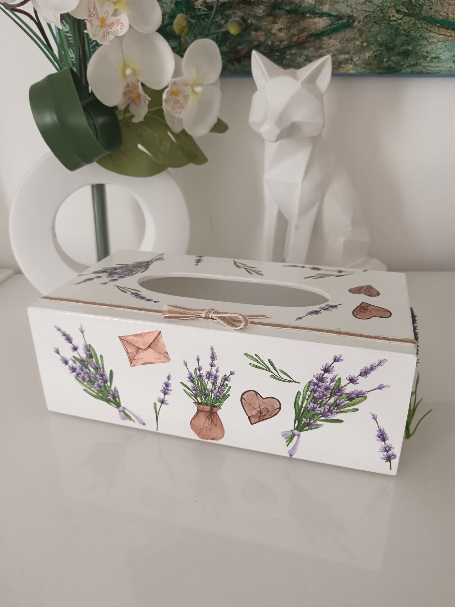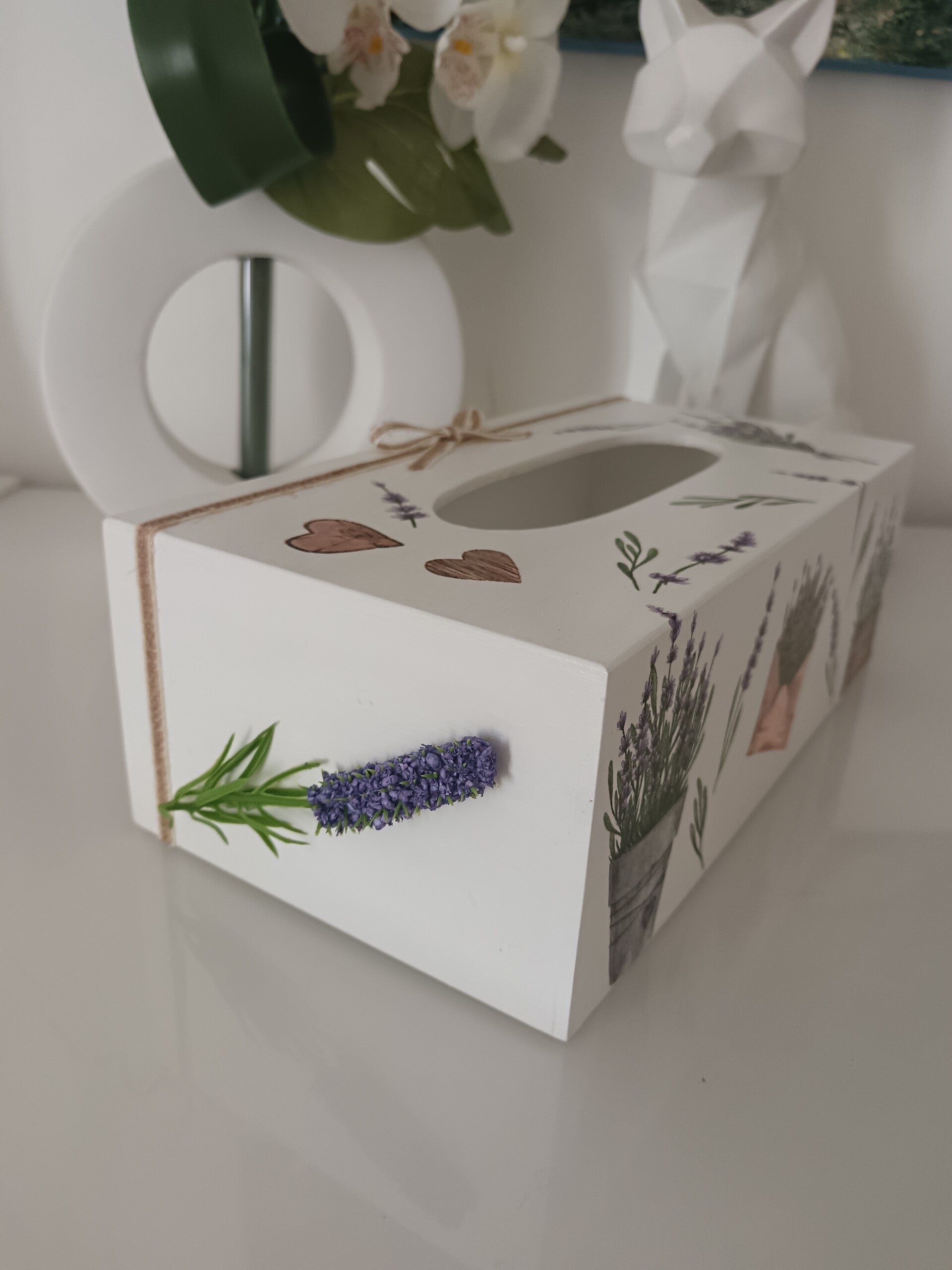 Apportez une touche de charme champêtre à votre intérieur avec cette élégante boîte à mouchoirs en bois, décorée de jolis motifs floraux de lavande et d’illustrations rustiques. Décorée à la main avec la technique du serviettage, elle est idéale pour embellir une salle de bain, une chambre ou un salon. Son brin de lavande artificiel sur le côté ajoute une note provençale et raffinée. Un accessoire pratique et décoratif à la fois, parfait pour les amoureux de la nature et de la Provence. Création artisanale et unique.