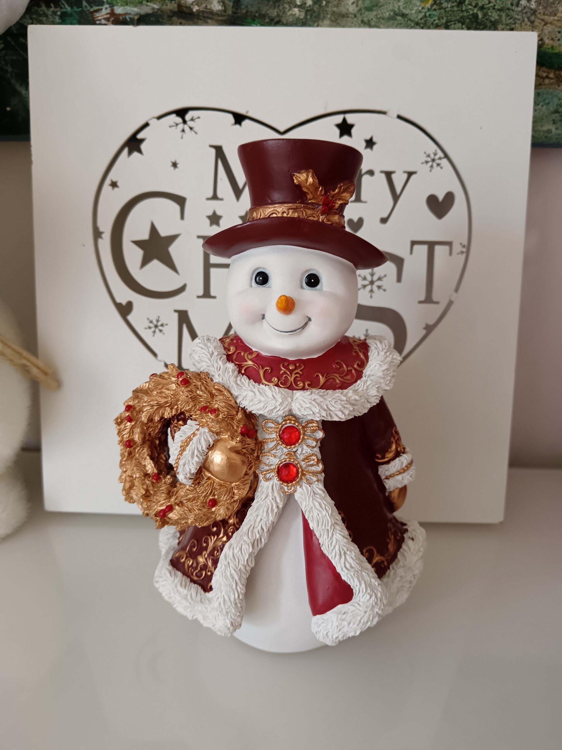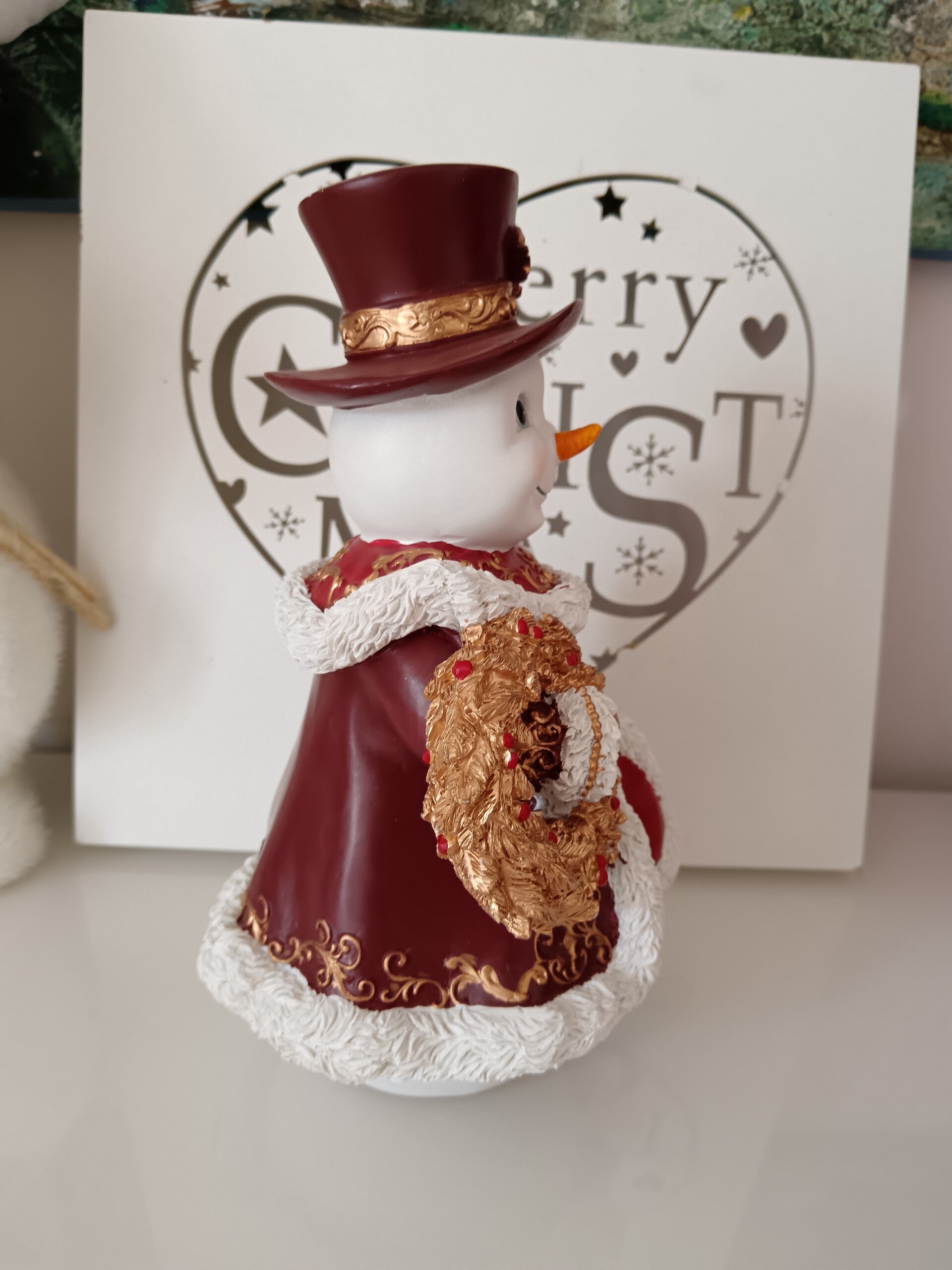 Craquez pour ce bonhomme de neige élégant, habillé d’un manteau bordeaux orné de détails dorés et de faux rubis. Avec sa couronne festive à la main et son sourire chaleureux, il apporte une touche chic et joyeuse à votre déco de Noël. En polyrésine. Découvrez également le Père Noël de la même collection: Père Noël vintage avec cloche