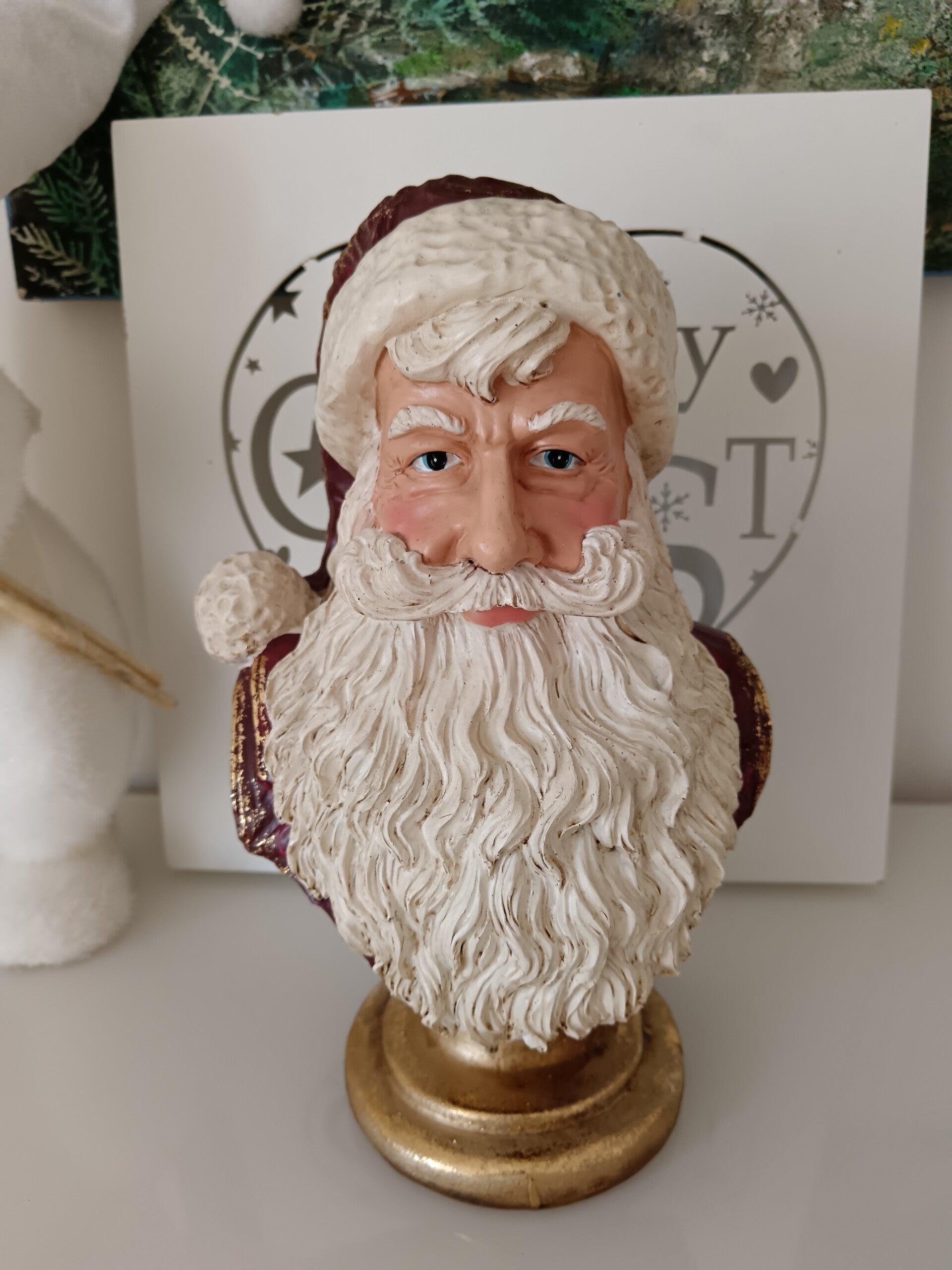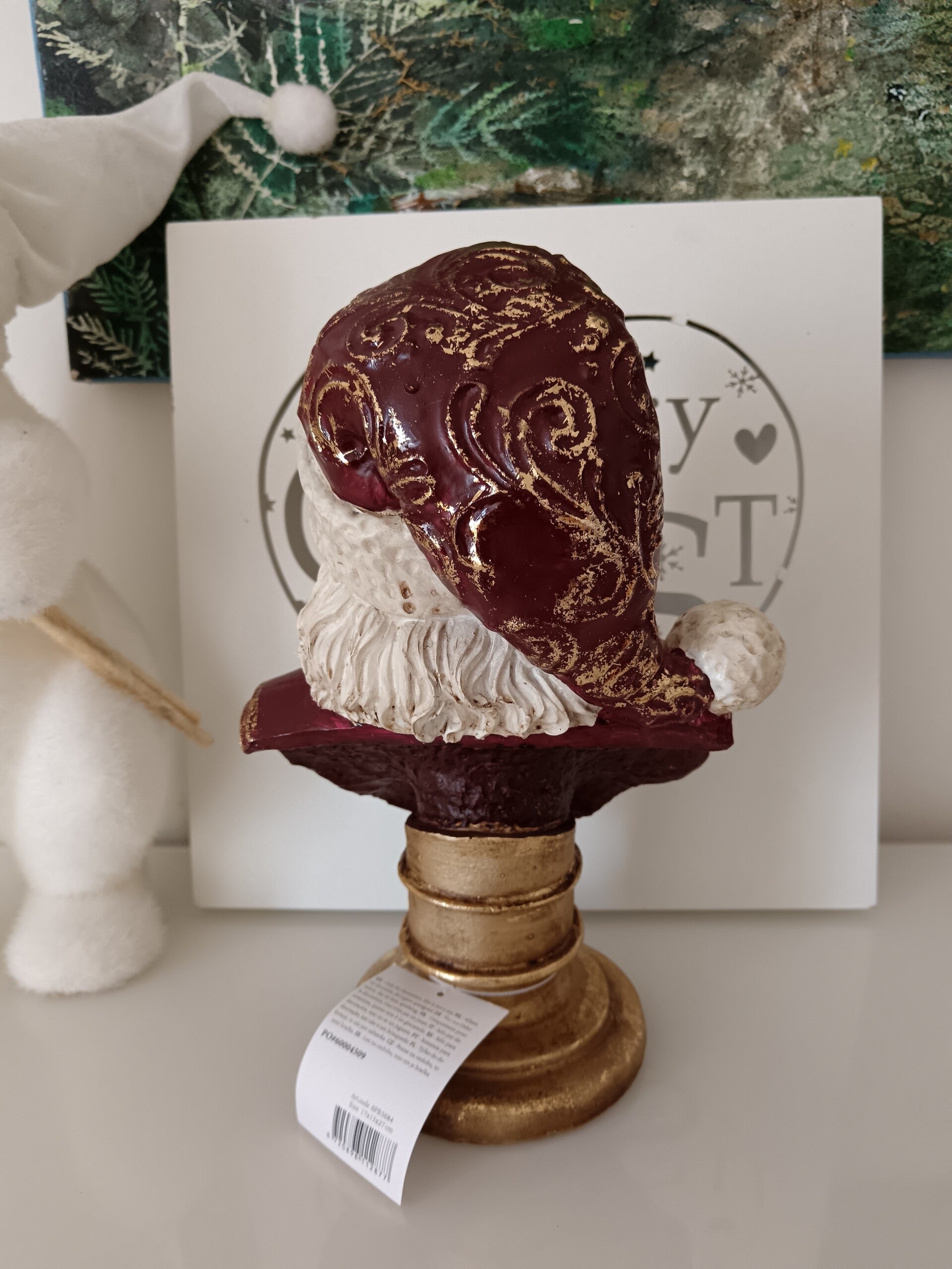 Apportez une note de raffinement intemporel à votre intérieur avec ce splendide buste de Père Noël. Il arbore un regard bienveillant, une barbe majestueuse et un bonnet rouge traditionnel, le tout reposant sur un socle doré élégant qui lui confère un charme classique. En polyrésine.